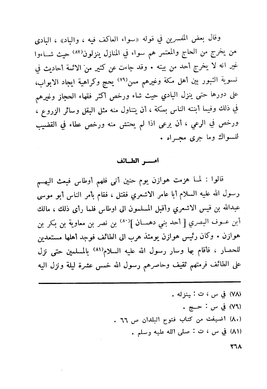 قالوا: لما هزمت هوازن يوم حنين أتى فلهم أوطاس فبعث اليهم رسول الله عليه السلام أبا عامر الاشعري فقتل، فقام بأمر الناس أبو موسى عبد الله بن قيس الاشعري وأقبل المسلمون الى اوطاس فلما رأى ذلك، مالك أبن عوف البصري [أحد بني دهمان] «80» بن نصر بن معاوية بن بكر بن هوازن. وكان رئيس هوازن يومئذ هرب الى الطائف فوجد أهلها مستعدين للحصار، فأقام بها وسار رسول الله عليه السلام «81» بالمسلمين حتى نزل على الطائف فرمتهم ثقيف وحاصرهم رسول الله خمس عشرة ليلة ونزل اليه