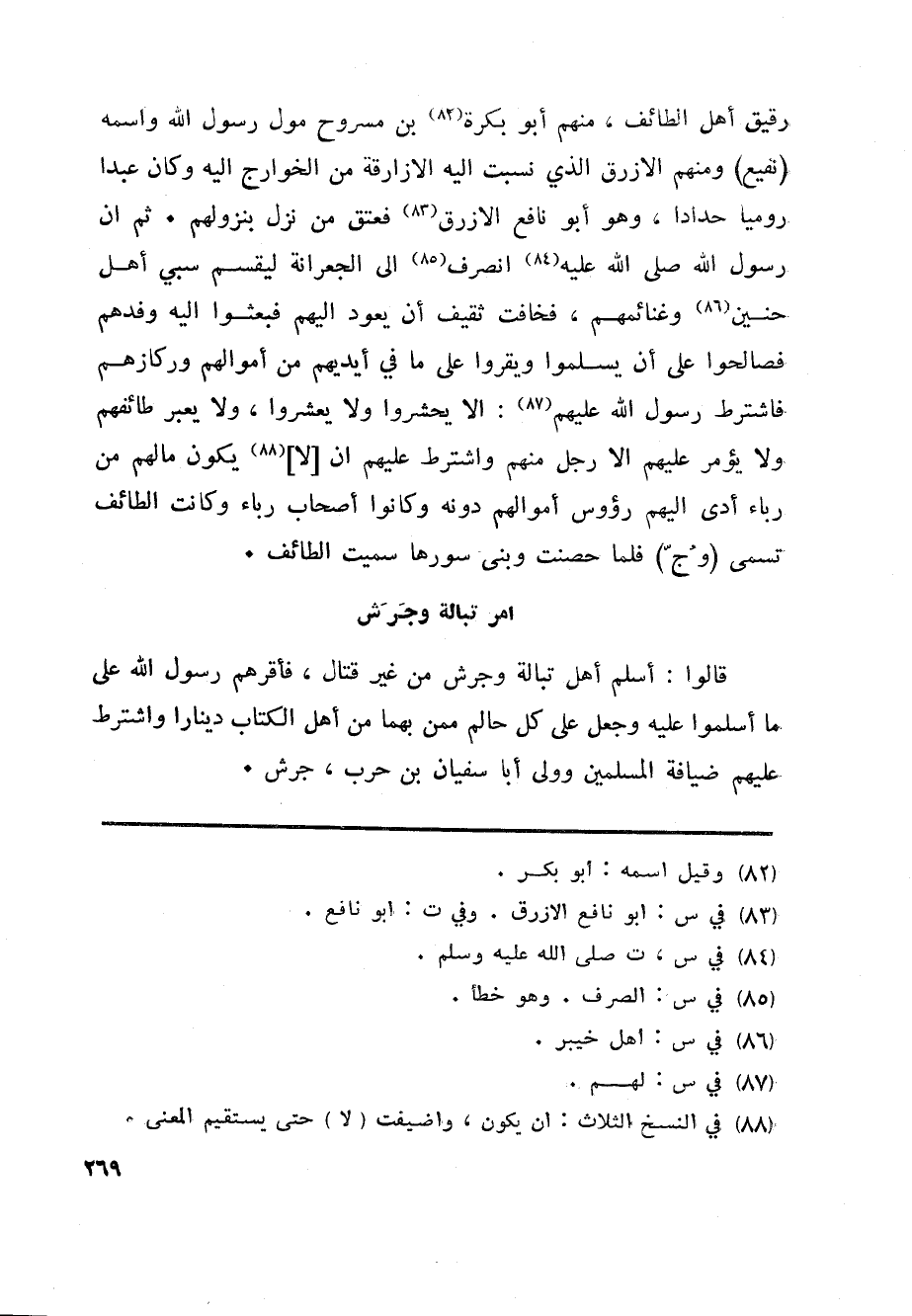رقيق أهل الطائف، منهم أبو بكرة «82» بن مسروح مول رسول الله واسمه (نفيع) ومنهم الازرق الذي نسبت اليه الازارقة من الخوارج اليه وكان عبدا روميا حدادا، وهو أبو نافع الازرق «83» فعتق من نزل بنزولهم. ثم ان رسول الله صلى الله عليه «84» انصرف «85» الى الجعرانة ليقسم سبي أهل حنين «86» وغنائمهم، فخافت ثقيف أن يعود اليهم فبعثوا اليه وفدهم فصالحوا على أن يسلموا ويقروا على ما في أيديهم من أموالهم وركازهم فاشترط رسول الله عليهم «87» : الا يحشروا ولا يعشروا، ولا يعبر طائفهم ولا يؤمر عليهم الا رجل منهم واشترط عليهم ان [لا] «88» يكون مالهم من رباء أدى اليهم رؤوس أموالهم دونه وكانوا أصحاب رباء وكانت الطائف تسمى (وجّ) فلما حصنت وبنى سورها سميت الطائف.
