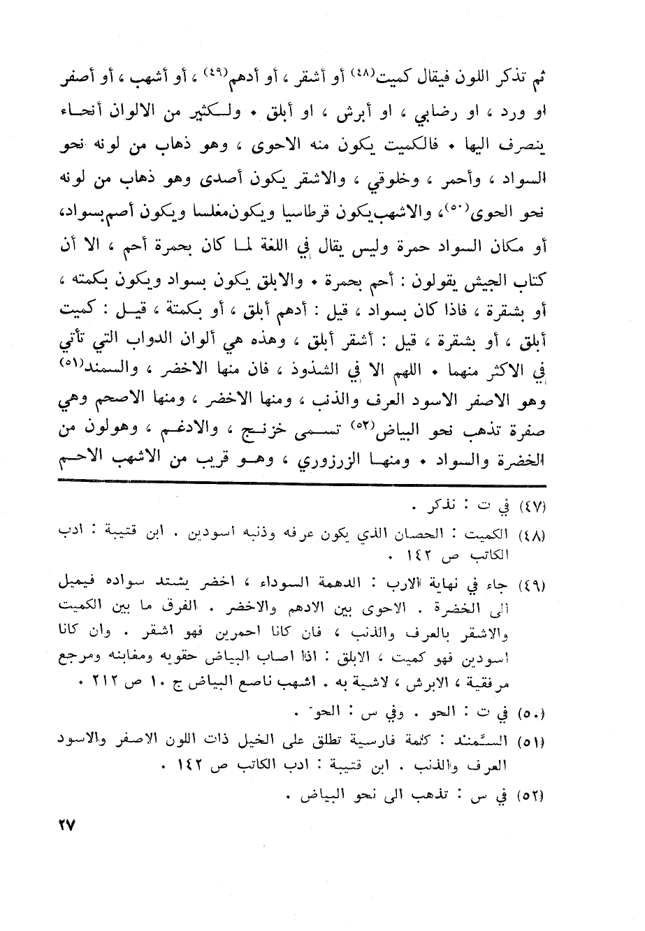 ثم تذكر «47» اللون فيقال كميت «48» أو أشقر، أو أدهم «49» ، أو أشهب، أو أصفر او ورد، او رضابي، او أبرش، او أبلق. ولكثير من الالوان أنحاء ينصرف اليها. فالكميت يكون منه الاحوى، وهو ذهاب من لونه نحو السواد، وأحمر، وخلوقي، والاشقر يكون أصدى وهو ذهاب من لونه نحو الحوى «50» ، والاشهب يكون قرطاسيا ويكون مغلسا ويكون أصم بسواد، أو مكان السواد حمرة وليس يقال في اللغة لما كان بحمرة أحم، الا أن كتاب الجيش يقولون: أحم بحمرة. والابلق يكون بسواد ويكون بكمته، أو بشقرة، فاذا كان بسواد، قيل: أدهم أبلق، أو بكمتة، قيل: كميت أبلق، أو بشقرة، قيل: أشقر أبلق، وهذه هي ألوان الدواب التي تأتي في الاكثر منهما. اللهم الا في الشذوذ، فان منها الاخضر، والسمند «51» وهو الاصفر الاسود العرف والذنب، ومنها الاخضر، ومنها الاصحم وهي صفرة تذهب نحو البياض «52» تسمى خزنج، والادغم، وهولون من الخضرة والسواد. ومنها الزرزوري، وهو قريب من الاشهب الاحم