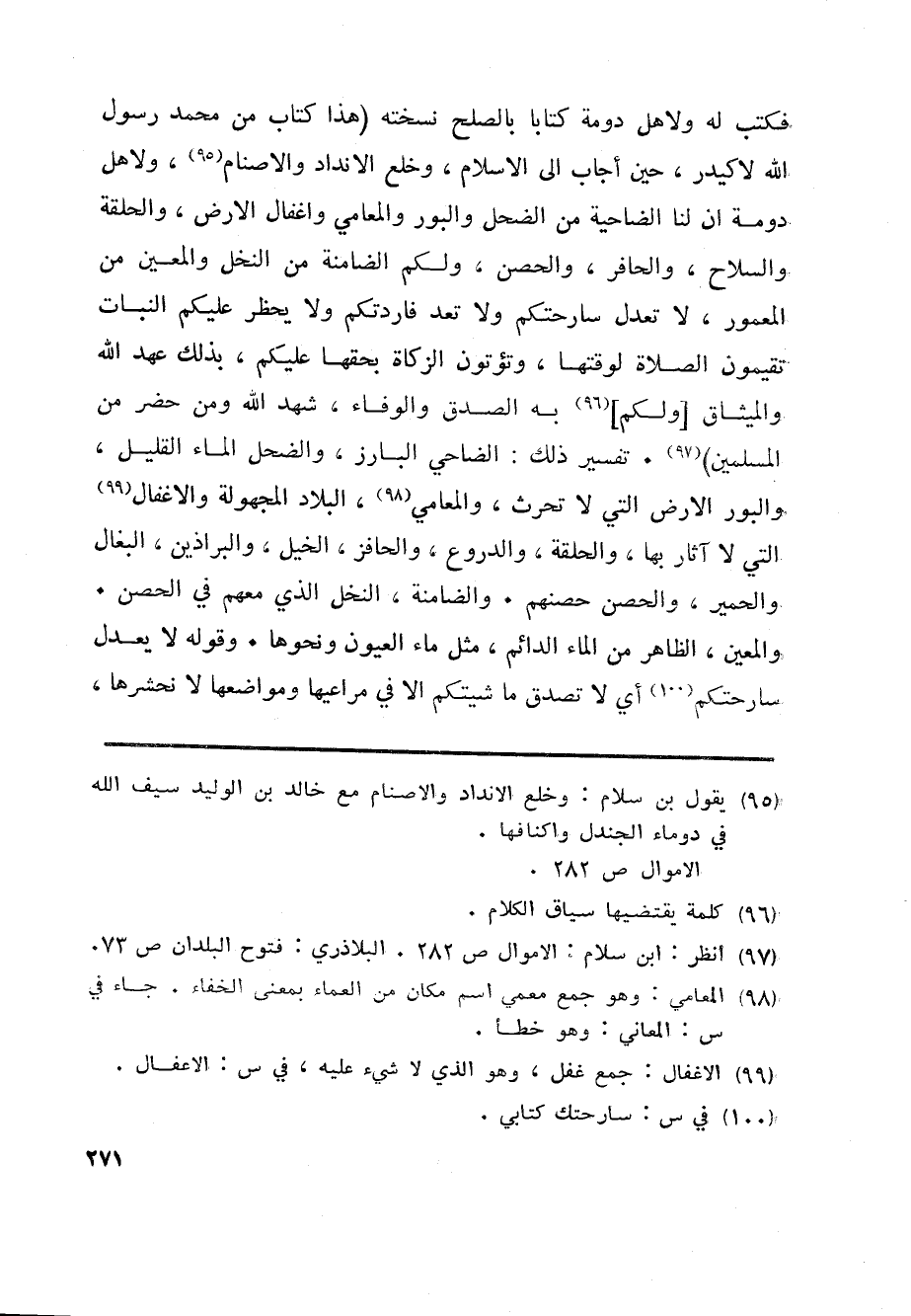 فكتب له ولاهل دومة كتابا بالصلح نسخته (هذا كتاب من محمد رسول الله لاكيدر، حين أجاب الى الاسلام، وخلع الانداد والاصنام «95» ، ولاهل دومة ان لنا الضاحية من الضحل والبور والمعامي واغفال الارض، والحلقة والسلاح، والحافر، والحصن، ولكم الضامنة من النخل والمعين من المعمور، لا تعدل سارحتكم ولا تعد فاردتكم ولا يحظر عليكم النبات تقيمون الصلاة لوقتها، وتؤتون الزكاة بحقها عليكم، بذلك عهد الله والميثاق [ولكم] «96» به الصدق والوفاء، شهد الله ومن حضر من المسلمين) «97» . تفسير ذلك: الضاحي البارز، والضحل الماء القليل، والبور الارض التي لا تحرث، والمعامي «98» ، البلاد المجهولة والاغفال «99» التي لا آثار بها، والحلقة، والدروع، والحافز، الخيل، والبراذين، البغال والحمير، والحصن حصنهم. والضامنة، النخل الذي معهم في الحصن.