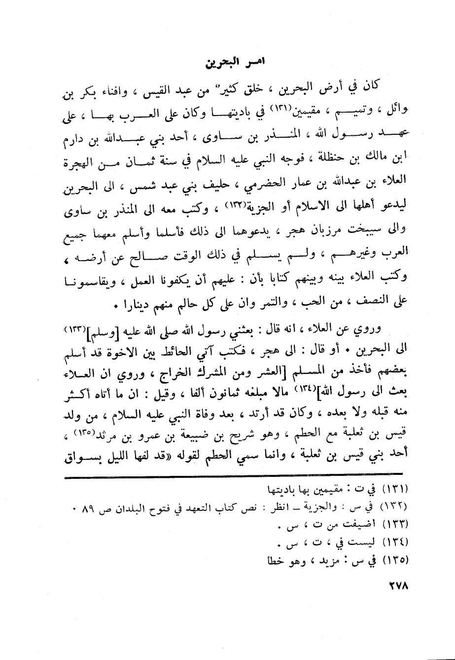 كان في أرض البحرين، خلق كثير من عبد القيس، وافناء بكر بن وائل، وتميم، مقيمين «131» في باديتها وكان على العرب بها، على عهد رسول الله، المنذر بن ساوى، أحد بني عبد الله بن دارم ابن مالك بن حنظلة، فوجه النبي عليه السلام في سنة ثمان من الهجرة العلاء بن عبد الله بن عمار الحضرمي، حليف بني عبد شمس، الى البحرين ليدعو أهلها الى الاسلام أو الجزية «132» ، وكتب معه الى المنذر بن ساوى والى سيبخت مرزبان هجر، يدعوهما الى ذلك فأسلما وأسلم معهما جميع العرب وغيرهم، ولم يسلم في ذلك الوقت صالح عن أرضه، وكتب العلاء بينه وبينهم كتابا بأن: عليهم أن يكفونا العمل، ويقاسمونا على النصف، من الحب، والتمر وان على كل حالم منهم دينارا.