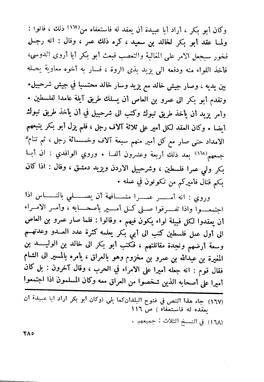 وأمر يزيد أن يأخذ طريق تبوك وكتب الى شرحبيل في أن يأخذ طريق تبوك أيضا. وكان العقد لكل أمير على ثلاثة آلاف رجل، فلم يزل أبو بكر يتبعهم الامداد حتى صار مع كل أمير منهم سبعة آلاف وخمسمائة رجل، ثم تتامّ جمعهم «168» بعد ذلك أربعة وعشرون ألفا. وروي الواقدي: ان أبا بكر ولي عمرا فلسطين، وشرحبيل الاردن ويزيد دمشق، وقال: اذا كان بكم قتال فأميركم من تكونون في عمله.