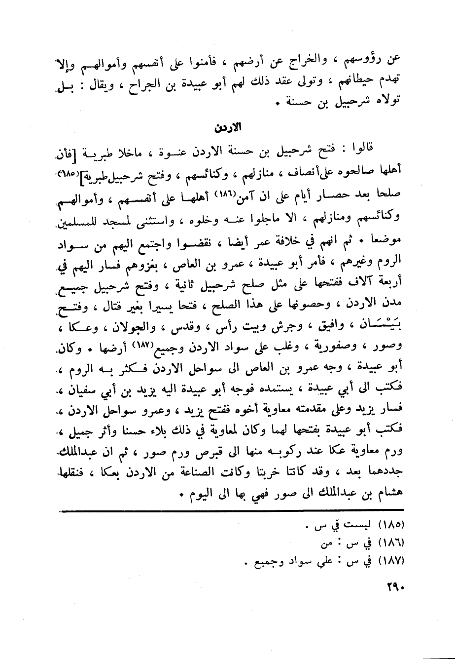 قالوا: فتح شرحبيل بن حسنة الاردن عنوة، ما خلا طبرية [فأن أهلها صالحوه على أنصاف، منازلهم، وكنائسهم، وفتح شرحبيل طبرية] «185» صلحا بعد حصار أيام على ان آمن «186» أهلها على أنفسهم، وأموالهم وكنائسهم ومنازلهم، الا ماجلوا عنه وخلوه، واستثنى لمسجد للمسلمين موضعا. ثم انهم في خلافة عمر أيضا، نقضوا واجتمع اليهم من سواد الروم وغيرهم، فأمر أبو عبيدة، عمرو بن العاص، بغزوهم فسار اليهم في أربعة آلاف ففتحها على مثل صلح شرحبيل ثانية، وفتح شرحبيل جميع مدن الاردن، وحصونها على هذا الصلح، فتحا يسيرا بغير قتال، وفتح بيسان، وافيق، وجرش وبيت رأس، وقدس، والجولان، وعكا، وصور، وصفورية، وغلب على سواد الاردن وجميع «187» أرضها. وكان أبو عبيدة، وجه عمرو بن العاص الى سواحل الاردن فكثر به الروم، فكتب الى أبي عبيدة، يستمده فوجه أبو عبيدة اليه يزيد بن أبي سفيان، فسار يزيد وعلى مقدمته معاوية أخوه ففتح يزيد، وعمرو سواحل الاردن، فكتب أبو عبيدة بفتحها لهما وكان لمعاوية في ذلك بلاء حسنا وأثر جميل، ورم معاوية عكا عند ركوبه منها الى قبرص ورم صور، ثم ان عبد الملك جددهما بعد، وقد كانتا خربتا وكانت الصناعة من الاردن بعكا، فنقلها هشام بن عبد الملك الى صور فهي بها الى اليوم.