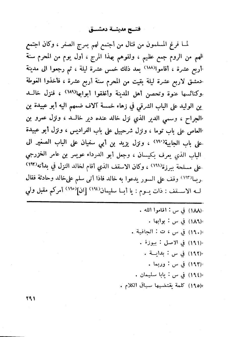 لما فرغ المسلمون من قتال من أجتمع لهم بمرج الصفر، وكان اجتمع الهم من الروم جمع عظيم، ولقوهم بهذا المرج، أول يوم من المحرم سنة أربع عشرة، أقاموا «188» بعد ذلك خمس عشرة ليلة، ثم رجعوا الى مدينة دمشق لاربع عشرة ليلة بقيت من المحرم سنة أربع عشرة، فأخذوا الغوطة وكنائسها عنوة وتحصن أهل المدينة وأغلقوا أبوابها «189» ، فنزل خالد بن الوليد على الباب الشرقي في زهاء خمسة آلاف ضمهم اليه أبو عبيدة بن الجراح، وسمي الدير الذي نزل خالد عنده دير خالد، ونزل عمرو بن العاص على باب توما، ونزل شرحبيل على باب الفراديس، ونزل أبو عبيدة على باب الجابية «190» ، ونزل يزيد بن أبي سفيان على الباب الصغير الى الباب الذي يعرف بكيسان، وجعل أبو الدرداء عويمر بن عامر الخزرجي على مسلحة ببرزة «191» ، وكان الاسقف الذي أقام لخالد النزل في بدأته «192» ربما «193» وقف على السور يدعوا به خالد فاذا أتى سلم على خالد وحادثة فقال له الاسقف: ذات يوم: يا أبا سليمان «194» [ان] «195» أمركم مقبل ولي