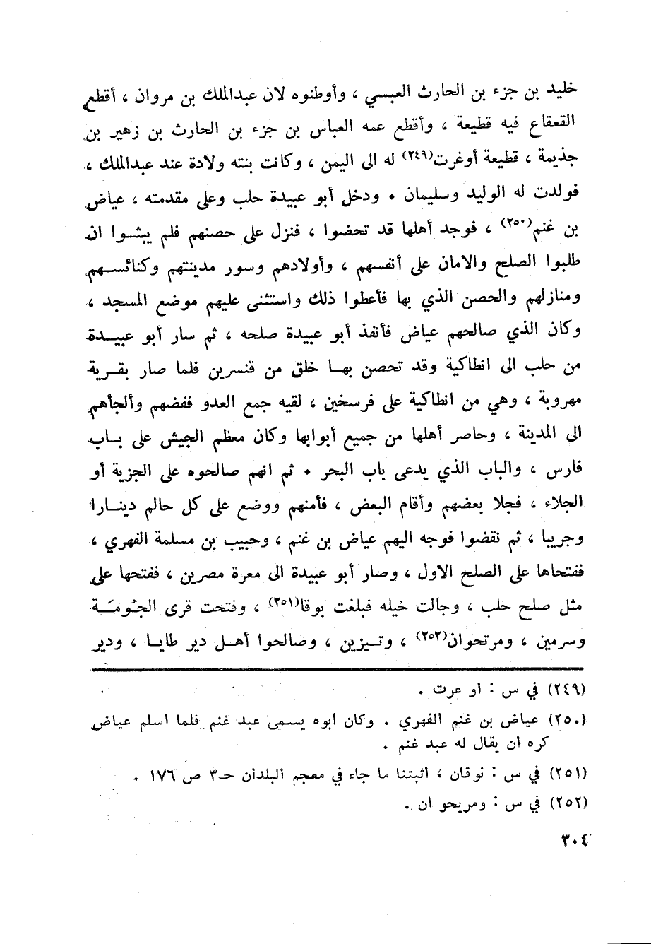 خليد بن جزء بن الحارث العبسي، وأوطنوه لان عبد الملك بن مروان، أقطع القعقاع فيه قطيعة، وأقطع عمه العباس بن جزء بن الحارث بن زهير بن جذيمة، قطيعة أوغرت «249» له الى اليمن، وكانت بنته ولادة عند عبد الملك، فولدت له الوليد وسليمان. ودخل أبو عبيدة حلب وعلى مقدمته، عياض بن غنم «250» ، فوجد أهلها قد تحضوا، فنزل على حصنهم فلم يبثوا ان طلبوا الصلح والامان على أنفسهم، وأولادهم وسور مدينتهم وكنائسهم ومنازلهم والحصن الذي بها فأعطوا ذلك واستثنى عليهم موضع المسجد، وكان الذي صالحهم عياض فأنفذ أبو عبيدة صلحه، ثم سار أبو عبيدة من حلب الى انطاكية وقد تحصن بها خلق من قنسرين فلما صار بقرية مهروبة، وهي من انطاكية على فرسخين، لقيه جمع العدو ففضهم وألجأهم الى المدينة، وحاصر أهلها من جميع أبوابها وكان معظم الجيش على باب فارس، والباب الذي يدعى باب البحر. ثم انهم صالحوه على الجزية أو الجلاء، فجلا بعضهم وأقام البعض، فأمنهم ووضع على كل حالم دينارا وجريبا، ثم نقضوا فوجه اليهم عياض بن غنم، وحبيب بن مسلمة الفهري، ففتحاها على الصلح الاول، وصار أبو عبيدة الى معرة مصرين، ففتحها على مثل صلح حلب، وجالت خيله فبلغت بوقا «251» ، وفتحت قرى الجومة وسرمين، ومرتحوان «252» ، وتيزين، وصالحوا أهل دير طايا، ودير