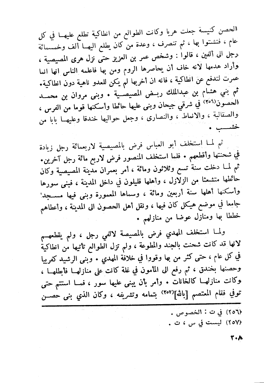 ثم بني هشام بن عبد الملك ربض المصيصية. وبنى مروان بن محمد الحصون «256» في شرقي جيحان وبنى عليها حائطا وأسكنها قوما من الفرس، والصقالبة، والانماط، والنصارى، وجعل حواليها خندقا وعليها بابا من خشب.