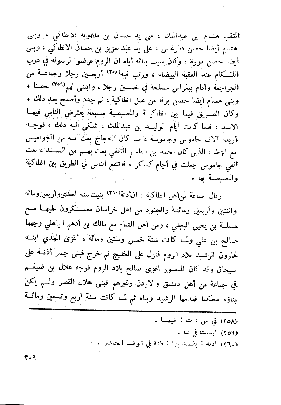 وقال جماعة من أهل انطاكية: ان أذنة «260» بنيت سنة احدى وأربعين ومائة واثنتين وأربعين ومائة والجنود من أهل خراسان معسكرون عليها مع مسلمة بن يحيى البجلي، ومن أهل الشام مع مالك بن أدهم الباهلي وجهها صالح بن علي ولما كانت سنة خمس وستين ومائة، أغزى المهدي ابنه هارون الرشيد بلاد الروم فنزل على الخليج ثم خرج فبنى جسر أذنة على سيحان وقد كان المنصور أغزى صالح بلاد الروم فوجه هلال بن ضيغم في جماعة من أهل دمشق والاردن وغيرهم فبنى هلال القصر ولم يكن بناؤه محكما فهدمها الرشيد وبناه ثم لما كانت سنة أربع وتسعين ومائة