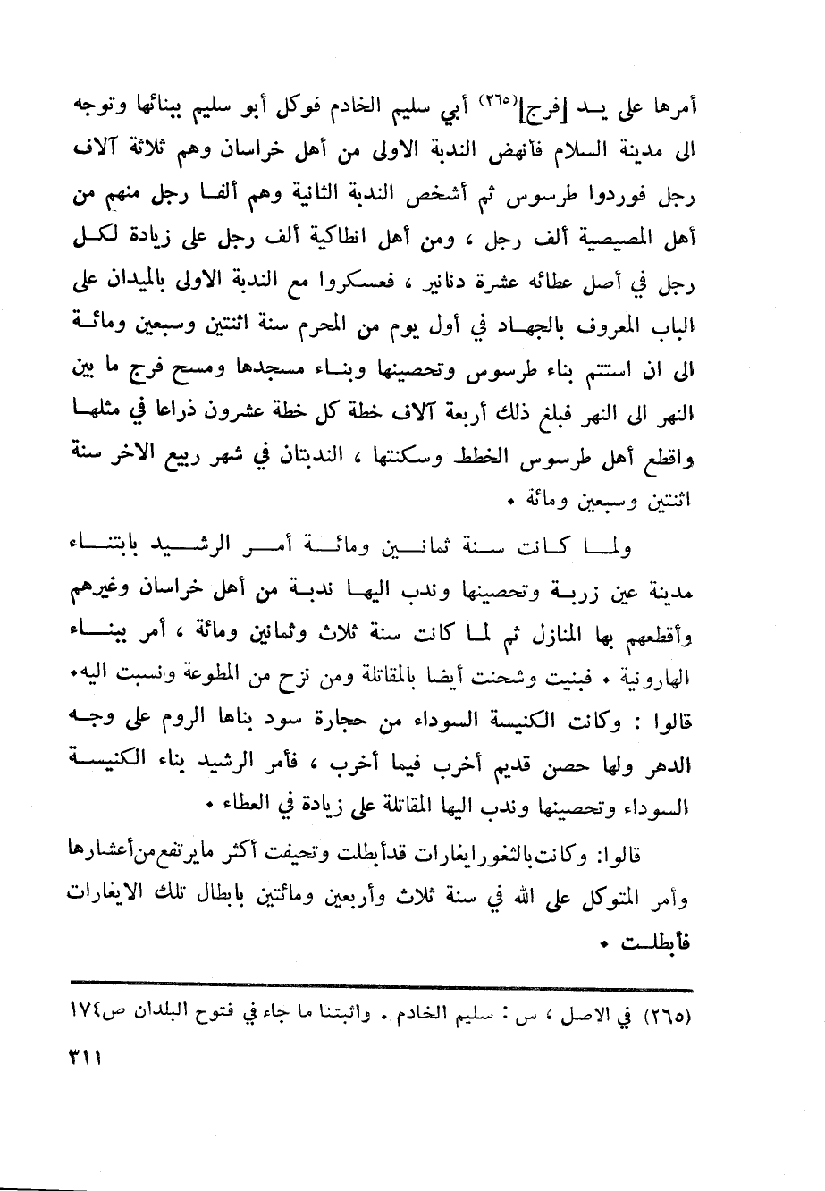 أمرها على يد [فرج] «265» أبي سليم الخادم فوكل أبو سليم ببنائها وتوجه الى مدينة السلام فأنهض الندبة الاولى من أهل خراسان وهم ثلاثة آلاف رجل فوردوا طرسوس ثم أشخص الندبة الثانية وهم ألفا رجل منهم من أهل المصيصية ألف رجل، ومن أهل انطاكية ألف رجل على زيادة لكل رجل في أصل عطائه عشرة دنانير، فعسكروا مع الندبة الاولى بالميدان على الباب المعروف بالجهاد في أول يوم من المحرم سنة اثنتين وسبعين ومائة الى ان استتم بناء طرسوس وتحصينها وبناء مسجدها ومسح فرج ما بين النهر الى النهر فبلغ ذلك أربعة آلاف خطة كل خطة عشرون ذراعا في مثلها واقطع أهل طرسوس الخطط وسكنتها، الندبتان في شهر ربيع الاخر سنة اثنتين وسبعين ومائة.