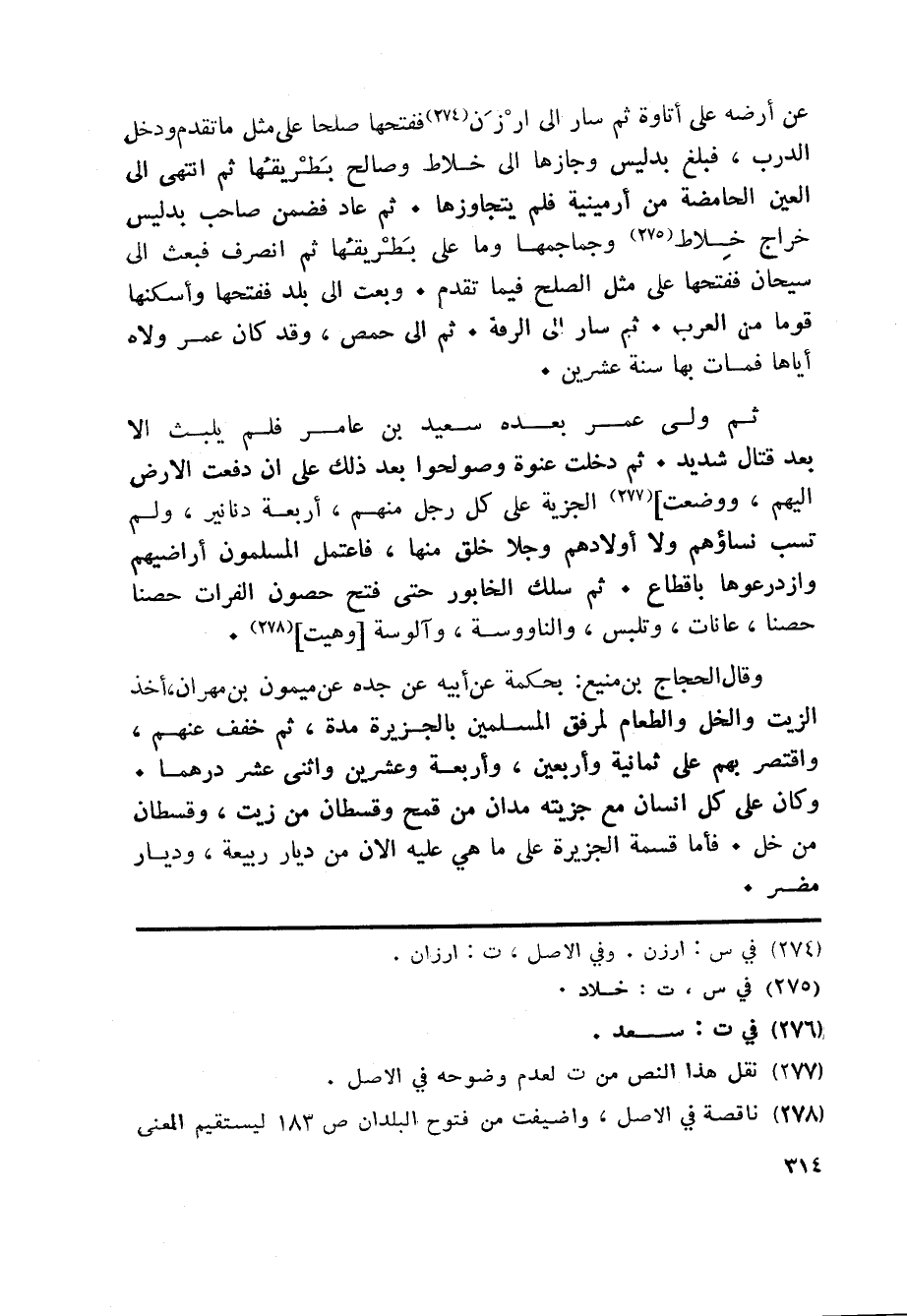 ثم ولى عمر بعده سعيد «276» بن عامر فلم يلبث الا بعد قتال شديد. ثم دخلت عنوة وصولحوا بعد ذلك على ان دفعت الارض اليهم، ووضعت] «277» الجزية على كل رجل منهم، أربعة دنانير، ولم تسب نساؤهم ولا أولادهم وجلا خلق منها، فاعتمل المسلمون أراضيهم وازدرعوها باقطاع. ثم سلك الخابور حتى فتح حصون الفرات حصنا حصنا، عانات، وتلبس، والناووسة، وآلوسة [وهيت] «278» .