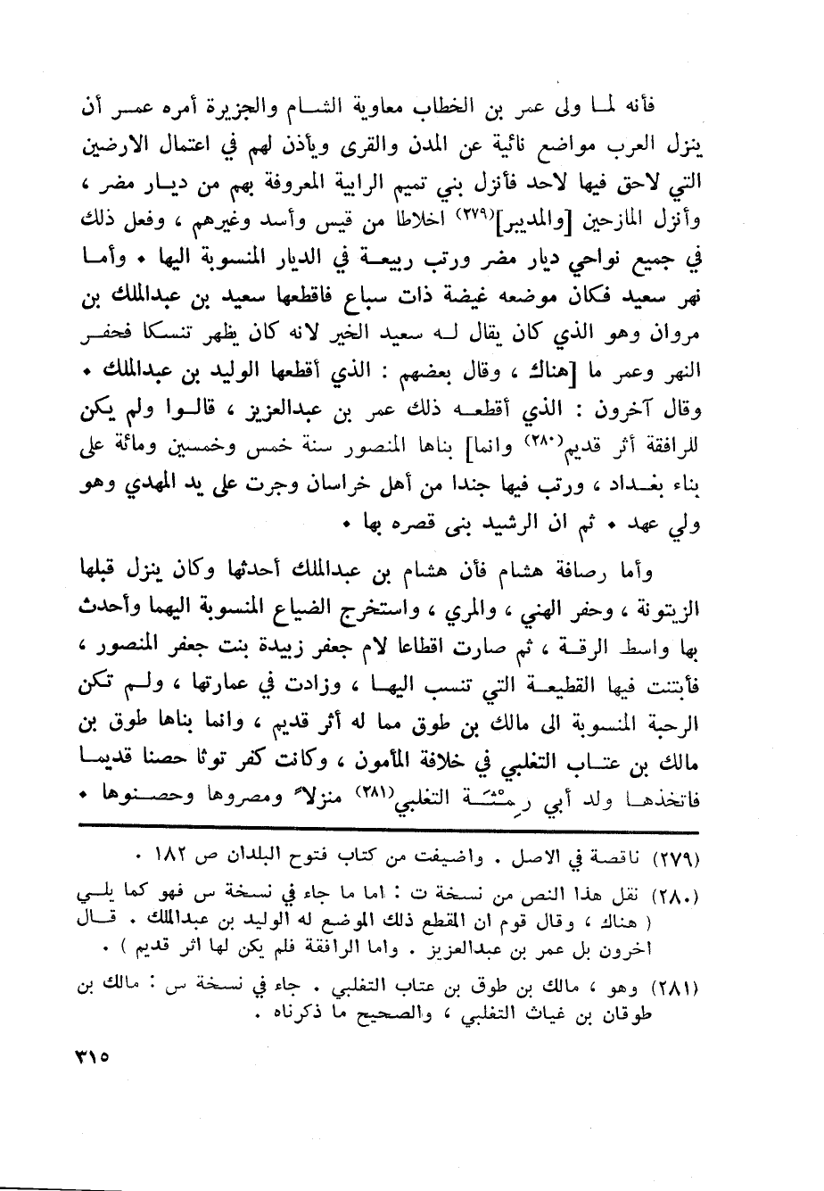 فأنه لما ولى عمر بن الخطاب معاوية الشام والجزيرة أمره عمر أن ينزل العرب مواضع نائية عن المدن والقرى ويأذن لهم في اعتمال الارضين التي لاحق فيها لاحد فأنزل بني تميم الرابية المعروفة بهم من ديار مضر، وأنزل المازحين [والمديبر] «279» اخلاطا من قيس وأسد وغيرهم، وفعل ذلك في جميع نواحي ديار مضر ورتب ربيعة في الديار المنسوبة اليها. وأما نهر سعيد فكان موضعه غيضة ذات سباع فاقطعها سعيد بن عبد الملك بن مروان وهو الذي كان يقال له سعيد الخير لانه كان يظهر تنسكا فحفر النهر وعمر ما [هناك، وقال بعضهم: الذي أقطعها الوليد بن عبد الملك.