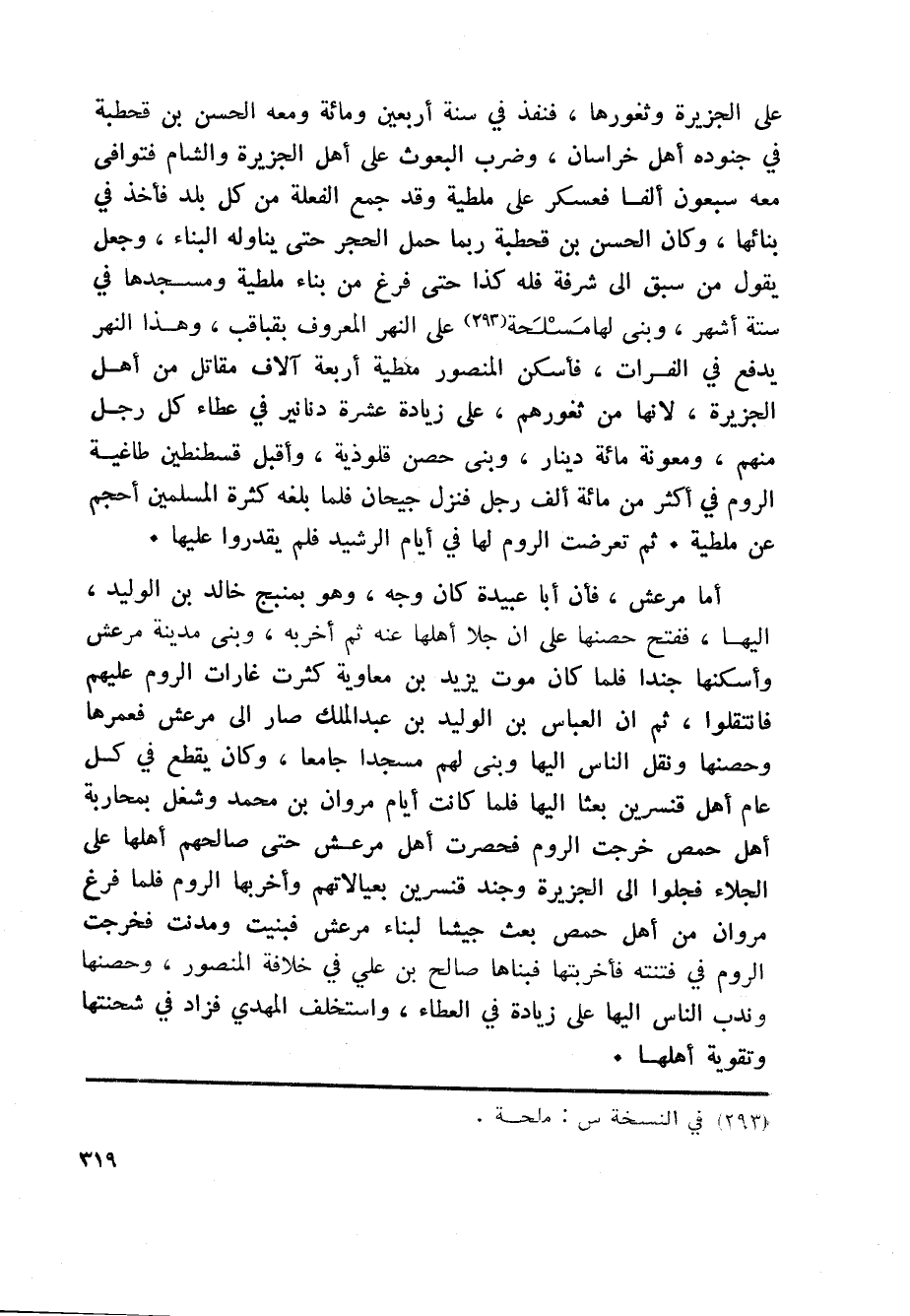على الجزيرة وثغورها، فنفذ في سنة أربعين ومائة ومعه الحسن بن قحطبة في جنوده أهل خراسان، وضرب البعوث على أهل الجزيرة والشام فتوافى معه سبعون ألفا فعسكر على ملطية وقد جمع الفعلة من كل بلد فأخذ في بنائها، وكان الحسن بن قحطبة ربما حمل الحجر حتى يناوله البناء، وجعل يقول من سبق الى شرفة فله كذا حتى فرغ من بناء ملطية ومسجدها في ستة أشهر، وبنى لها مسلحة «293» على النهر المعروف بقباقب، وهذا النهر يدفع في الفرات، فأسكن المنصور ملطية أربعة آلاف مقاتل من أهل الجزيرة، لانها من ثغورهم، على زيادة عشرة دنانير في عطاء كل رجل منهم، ومعونة مائة دينار، وبنى حصن قلوذية، وأقبل قسطنطين طاغية الروم في أكثر من مائة ألف رجل فنزل جيحان فلما بلغه كثرة المسلمين أحجم عن ملطية. ثم تعرضت الروم لها في أيام الرشيد فلم يقدروا عليها.