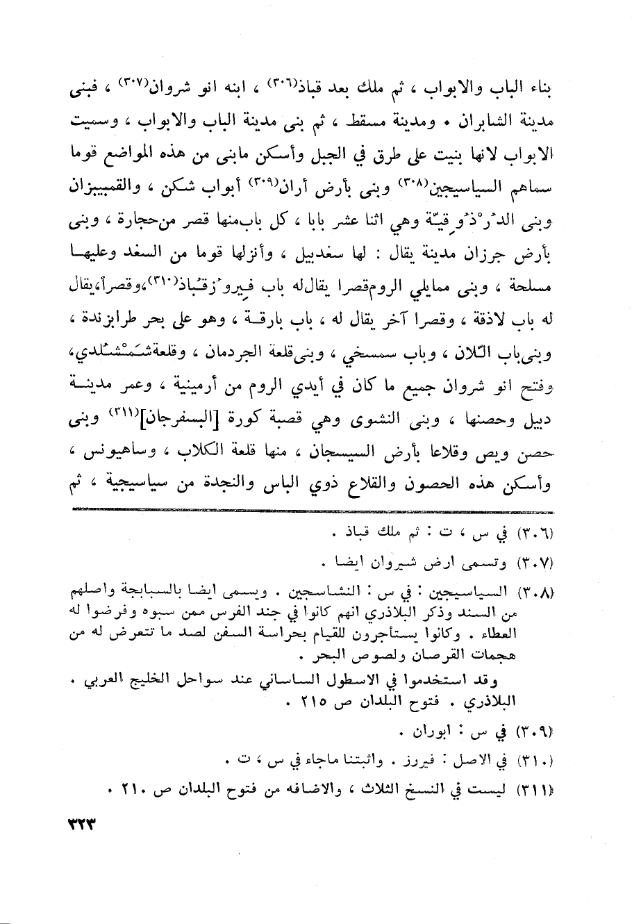بناء الباب والابواب، ثم ملك بعد قباذ «306» ، ابنه انوشروان «307» ، فبنى مدينة الشابران. ومدينة مسقط، ثم بنى مدينة الباب والابواب، وسميت الابواب لانها بنيت على طرق في الجبل وأسكن ما بنى من هذه المواضع قوما سماهم السياسيجين «308» وبنى بأرض أران «309» أبواب شكن، والقمبيزان وبنى الدرذوقيّة وهي اثنا عشر بابا، كل باب منها قصر من حجارة، وبنى بأرض جرزان مدينة يقال: لها سغدبيل، وأنزلها قوما من السغد وعليها مسلحة، وبنى مما يلي الروم قصرا يقال له باب فيروزقباذ «310» ، وقصرا، يقال له باب لاذقة، وقصرا آخر يقال له، باب بارقة، وهو على بحر طرابزندة، وبنى باب اللّان، وباب سمسخي، وبنى قلعة الجردمان، وقلعة شمشلدي، وفتح انوشروان جميع ما كان في أيدي الروم من أرمينية، وعمر مدينة دبيل وحصنها، وبنى النشوى وهي قصبة كورة [البسفرجان] «311» وبنى حصن ويص وقلاعا بأرض السيسجان، منها قلعة الكلاب، وساهيونس، وأسكن هذه الحصون والقلاع ذوي الباس والنجدة من سياسيجية، ثم