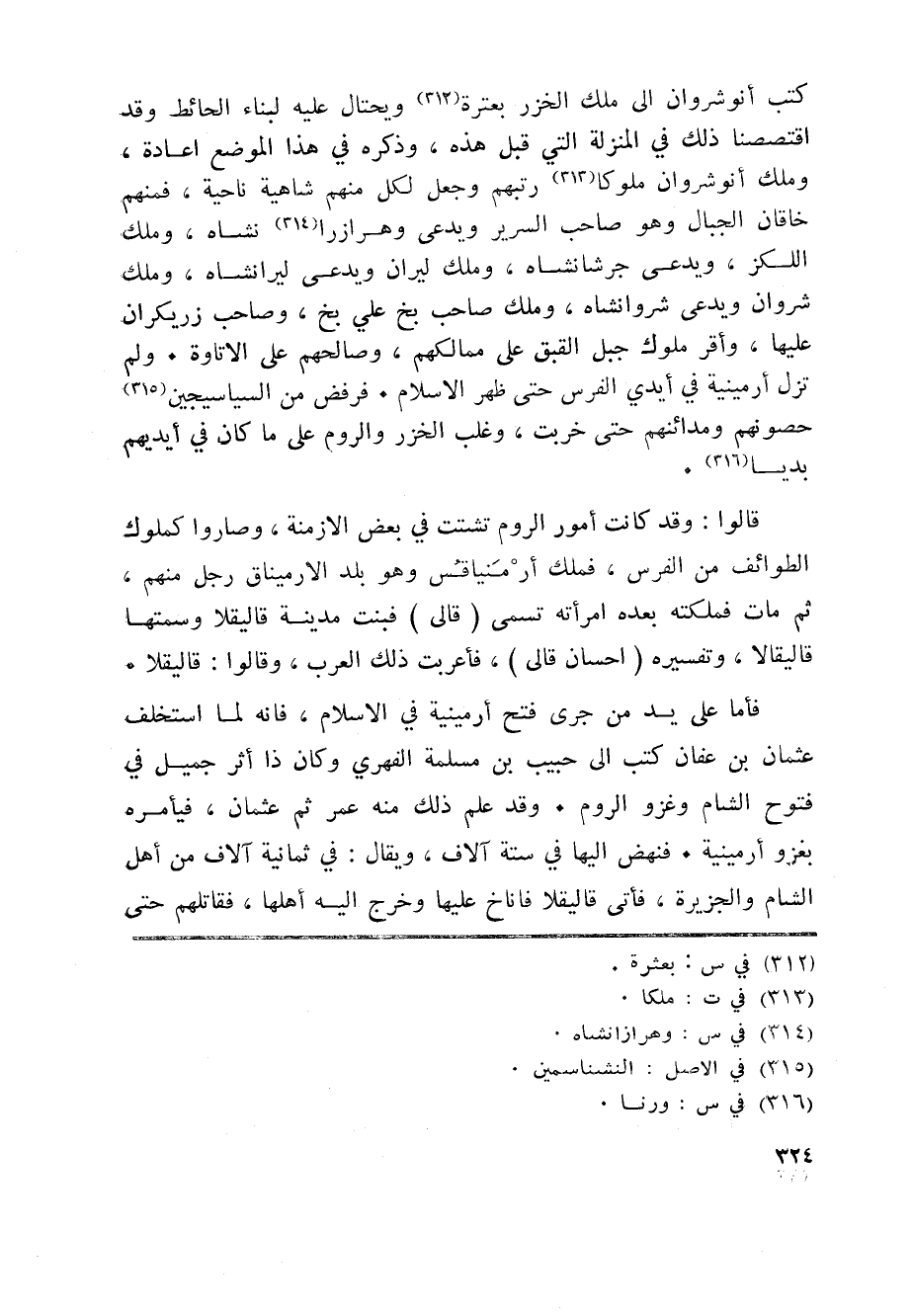 كتب أنو شروان الى ملك الخزر بعترة «312» ويحتال عليه لبناء الحائط وقد اقتصصنا ذلك في المنزلة التي قبل هذه، وذكره في هذا الموضع اعادة، وملك أنو شروان ملوكا «313» رتبهم وجعل لكل منهم شاهية ناحية، فمنهم خاقان الجبال وهو صاحب السرير ويدعى وهرازرا «314» نشاه، وملك اللكز، ويدعى جرشانشاه، وملك ليران ويدعى ليرانشاه، وملك شروان ويدعى شروانشاه، وملك صاحب بخ علي بخ، وصاحب زريكران عليها، وأقر ملوك جبل القبق على ممالكهم، وصالحهم على الاتاوة. ولم تزل أرمينية في أيدي الفرس حتى ظهر الاسلام. فرفض من السياسيجين «315» حصونهم ومدائنهم حتى خربت، وغلب الخزر والروم على ما كان في أيديهم بديا «316» .