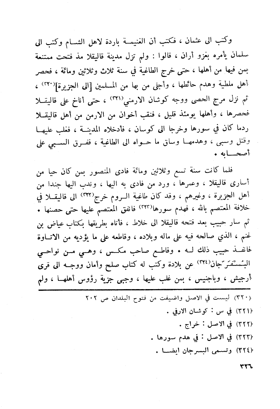 وكتب الى عثمان، فكتب أن الغنيمة باردة لاهل الشام وكتب الى سلمان يأمره بغزو أران، قالوا: ولم تزل مدينة قاليقلا مذ فتحت ممتنعة بمن فيها من أهلها، حتى خرج الطاغية في سنة ثلاث وثلاثين ومائة، فحصر أهل ملطية وهدم حائطها، وأجلى من بها من المسلمين [الى الجزيرة] «320» ، ثم نزل مرج الحصى ووجه كوشان الارمني «321» ، حتى أناخ على قاليقلا فحصرها، وأهلها يومئذ قليل، فنقب أخوان من الارمن من أهل قاليقلا ردما كان في سورها وخرجا الى كوسان، فأدخلاه المدينة، فغلب عليها وقتل وسبى، وهدمها وساق ما حواه الى الطاغية، ففرق السبي على أصحابه.