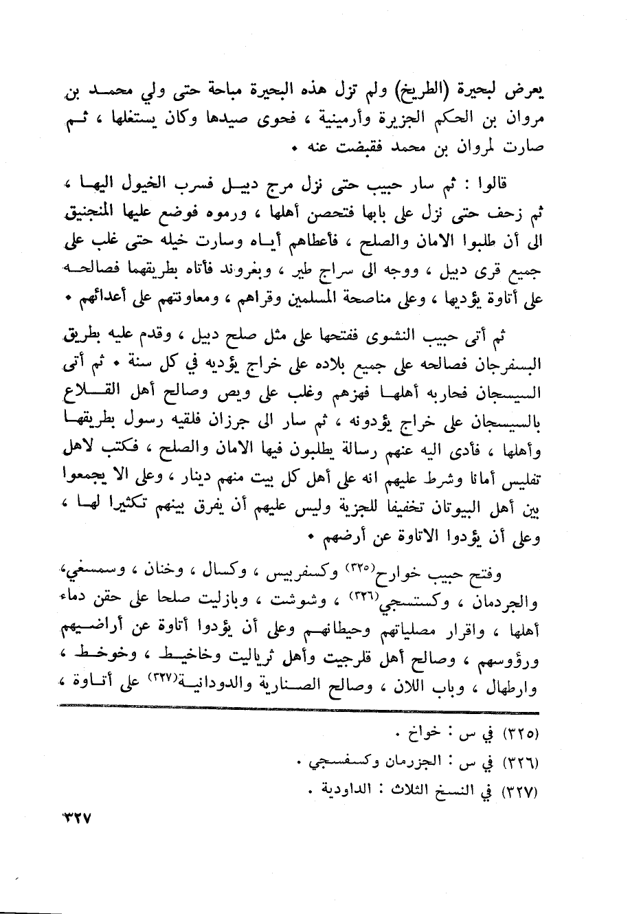 وفتح حبيب خوارح «325» وكسفربيس، وكسال، وخنان، وسمسغي، والجردمان، وكستسجي «326» ، وشوشت، وبازليت صلحا على حقن دماء أهلها، واقرار مصلياتهم وحيطانهم وعلى أن يؤدوا أتاوة عن أراضيهم ورؤوسهم، وصالح أهل قلرجيت وأهل ثرياليت وخاخيط، وخوخط، وارطهال، وباب اللان، وصالح الصنارية والدودانية «327» على أتاوة،