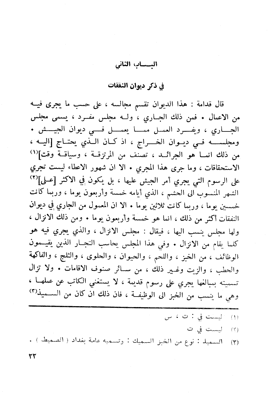 ومجلسه في ديوان الخراج، اذ كان الذي يحتاج [اليه، من ذلك انما هو الجرائد، تصنف من المرتزقة، وسياقة وقت] «1» الاستحقاقات، وما جرى هذا المجري. الا ان شهور الاعطاء ليست تجري على الرسوم التي يجري أمر الجيش عليها، بل يكون في الاكثر [على] «2» الشهر المنسوب الى الحشم، الذي أيامه خمسة وأربعون يوما، وربما كانت خمسين يوما، وربما كانت ثلاثين يوما. الا ان المعمول من الجاري في ديوان النفقات أكثر من ذلك، انما هو خمسة وأربعون يوما. ومن ذلك الانزال، ولها مجلس ينسب اليها، فيقال: مجلس الانزال، والذي يجري فيه هو كلما يقام من الانزال. وفي هذا المجلس يحاسب التجار الذين يقيمون الوظائف، من الخبز، واللحم، والحيوان، والحلوى، والثلج، والفاكهة والحطب، والزيت وغير ذلك، من سائر صنوف الاقامات. ولا تزال تسميته بمبالغها يجري على رسوم قديمة، لا يستغني الكاتب عن عملها، وهي ما ينسب من الخبز الى الوظيفة، فان ذلك ان كان من السميذ «3»