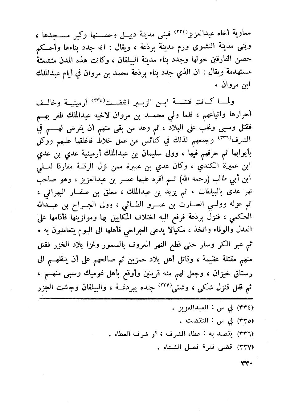 معاوية أخاه عبد العزيز «334» فبنى مدينة دبيل وحصنها وكبر مسجدها، وبنى مدينة النشوى ورم مدينة برذعة، ويقال: انه جدد بناءها وأحكم حصن الفارقين حولها وجدد بناء مدينة البيلقان، وكانت هذه المدن متشعثة مستهدمة ويقال: ان الذي جدد بناء برذعة محمد بن مروان في أيام عبد الملك ابن مروان.