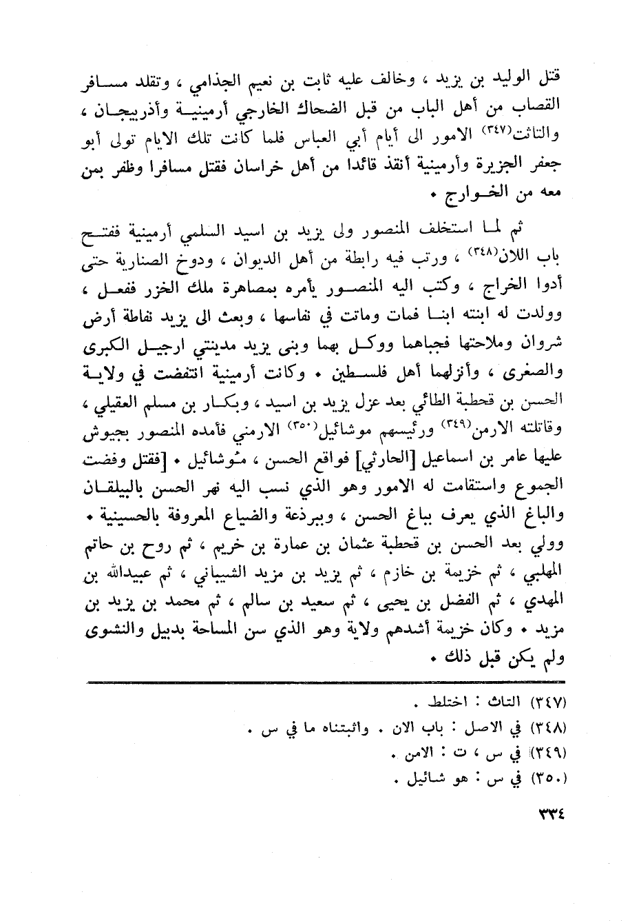 قتل الوليد بن يزيد، وخالف عليه ثابت بن نعيم الجذامي، وتقلد مسافر القصاب من أهل الباب من قبل الضحاك الخارجي أرمينية وأذربيجان، والتاثت «347» الامور الى أيام أبي العباس فلما كانت تلك الايام تولى أبو جعفر الجزيرة وأرمينية أنقذ قائدا من أهل خراسان فقتل مسافرا وظفر بمن معه من الخوارج.