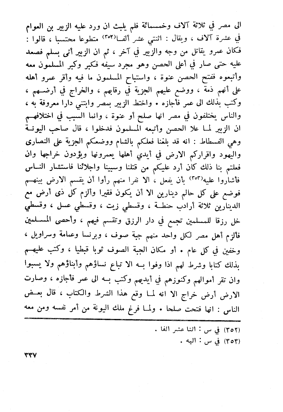 فكان عمرو يقاتل من وجه والزبير في آخر، ثم ان الزبير أتى بسلم فصعد عليه حتى صار في أعلى الحصن وهو مجرد سيفه فكبر وكبر المسلمون معه وأتبعوه ففتح الحصن عنوة، واستباح المسلمون ما فيه وأقر عمرو أهله على أنهم ذمة، ووضع عليهم الجزية في رقابهم، والخراج في أرضهم، وكتب بذلك الى عمر فأجازه. واختط الزبير بمصر وابتني دارا معروفة به، والناس يختلفون في مصر انها صلح أو عنوة، وانما السبب في اختلافهم ان الزبير لما علا الحصن وأتبعه المسلمون فدخلوا، قال صاحب اليونة وهي الفسطاط: انه قد بلغنا فعلكم بالشام ووضعكم الجزية على النصارى واليهود واقراركم الارض في أيدي أهلها يعمرونها ويؤدون خراجها وان فعلتم بنا ذلك كان أرد عليكم من قتلنا وسبينا واجلائنا فاستشار الناس فأشاروا عليه «353» بأن يفعل، الا نفرا منهم رأوا أن يقسم الارض بينهم فوضع على كل حالم دينارين الا أن يكون فقيرا وألزم كل ذى أرض مع الدينارين ثلاثة أرادب حنطة، وقسطي زيت، وقسطي عسل، وقسطي خل رزقا للمسلمين تجمع في دار الرزق وتقسم فيهم، وأحصى المسلمين فألزم أهل مصر لكل واحد منهم جبة صوف، وبرنسا وعمامة وسراويل، وخفين في كل عام. أو مكان الجبة الصوف ثوبا قبطيا، وكتب عليهم بذلك كتابا وشرط لهم اذا وفوا به الا تباع نساؤهم وأبناؤهم ولا يسبوا وان تقر أموالهم وكنوزهم في أيديهم وكتب به الى عمر فأجازه، وصارت الارض أرض خراج الا انه لما وقع هذا الشرط والكتاب، قال بعض الناس: انها فتحت صلحا. ولما فرغ ملك اليونة من أمر نفسه ومن معه