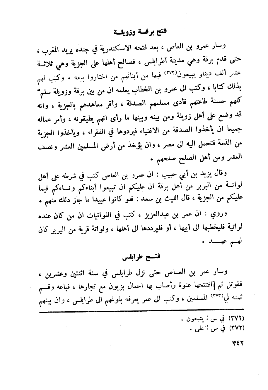 وسار عمرو بن العاص، بعد فتحه الاسكندرية في جنده يريد المغرب، حتى قدم برقة وهي مدينة أطرابلس، فصالح أهلها على الجزية وهي ثلاثة عشر ألف دينار يبيعون «372» فيها من أبنائهم من اختاروا بيعه. وكتب لهم بذلك كتابا، وكتب الى عمرو بن الخطاب يعلمه ان من بين برقة وزويلة سلم كلهم حسنة طاعتهم فأدى مسلمهم الصدقة، وأقر معاهدهم بالجزية، وانه قد وضع على أهل زويلة ومن بينه وبينها ما رأى انهم يطيقونه، وأمر عماله جميعا ان يأخذوا الصدقة من الاغنياء فيردوها في الفقراء، ويأخذوا الجزية من الذمة فتحمل اليه الى مصر، وان يؤخذ من أرض المسلمين العشر ونصف العشر ومن أهل الصلح صلحهم.