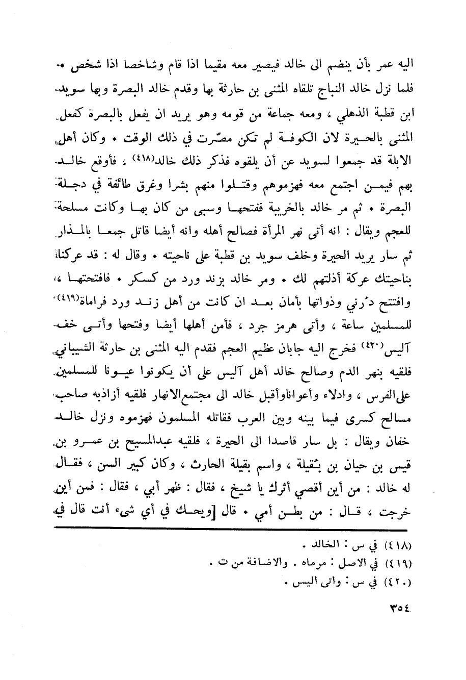 فلما نزل خالد النباج تلقاه المثنى بن حارثة بها وقدم خالد البصرة وبها سويد ابن قطبة الذهلي، ومعه جماعة من قومه وهو يريد ان يفعل بالبصرة كفعل المثنى بالحيرة لان الكوفة لم تكن مصّرت في ذلك الوقت. وكان أهل الابلة قد جمعوا لسويد عن أن يلقوه فذكر ذلك خالد «418» ، فأوقع خالد بهم فيمن اجتمع معه فهزموهم وقتلوا منهم بشرا وغرق طائفة في دجلة البصرة. ثم مر خالد بالخريبة ففتحها وسبى من كان بها وكانت مسلحة للعجم ويقال: انه أتى نهر المرأة فصالح أهله وانه أيضا قاتل جمعا بالمذار ثم سار يريد الحيرة وخلف سويد بن قطبة على ناحيته. وقال له: قد عركنا بناحيتك عركة أذلتهم لك. ومر خالد بزند ورد من كسكر. فافتحتها، وافتتح درني وذواتها بأمان بعد ان كانت من أهل زند ورد فراماة «419» للمسلمين ساعة، وأتى هرمز جرد، فأمن أهلها أيضا وفتحها وأتى خف آليس «420» فخرج اليه جابان عظيم العجم فقدم اليه المثنى بن حارثة الشيباني فلقيه بنهر الدم وصالح خالد أهل آليس على أن يكونوا عيونا للمسلمين على الفرس، وادلاء وأعوانا وأقبل خالد الى مجتمع الانهار فلقيه أزاذبه صاحب مسالح كسرى فيما بينه وبين العرب فقاتله المسلمون فهزموه ونزل خالد خفان ويقال: بل سار قاصدا الى الحيرة، فلقيه عبد المسيح بن عمرو بن قيس بن حيان بن بقيلة، واسم بقيلة الحارث، وكان كبير السن، فقال له خالد: من أين أقصي أثرك يا شيخ، فقال: ظهر أبي، فقال: فمن أين خرجت، قال: من بطن أمي. قال [ويحك في أي شيء أنت قال في