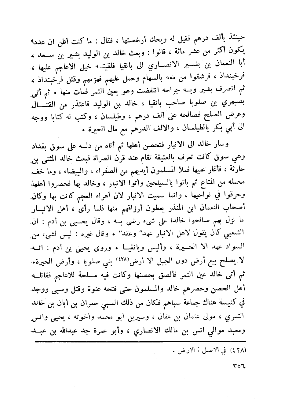 حينئذ بألف درهم فقيل له ويحك أرخصتها، فقال: ما كنت أظن ان عددا يكون أكثر من عشر مائة، قالوا: وبعث خالد بن الوليد بشير بن سعد، أبا النعمان بن بشير الانصاري الى بانقيا فلقيته خيل الاعاجم عليها، فرخبنداذ، فرشقوا من معه بالسهام وحمل عليهم فهزمهم وقتل فرخبنداذ، ثم انصرف بشير وبه جراحه انتفضت وهو بعين التمر فمات منها. ثم أتى بصبهري بن صلوبا صاحب بانقيا، خالد بن الوليد فاعتذر من القتال وعرض الصلح فصالحه على ألف درهم، وطيلسان، وكتب له كتابا ووجه الى أبي بكر بالطيلسان، والالف الدرهم مع مال الحيرة.