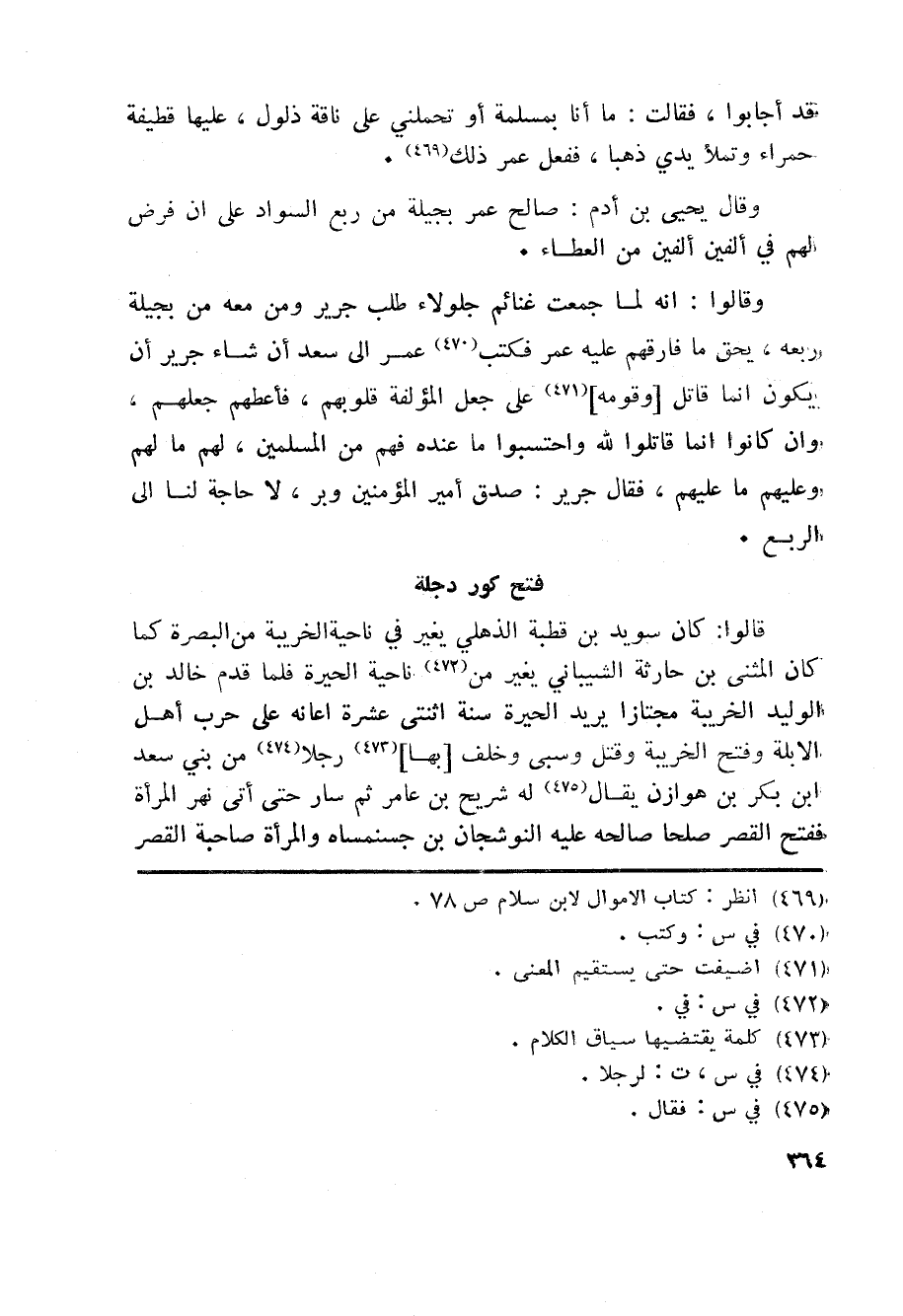 وقال يحيى بن أدم: صالح عمر بجيلة من ربع السواد على ان فرض لهم في ألفين ألفين من العطاء.