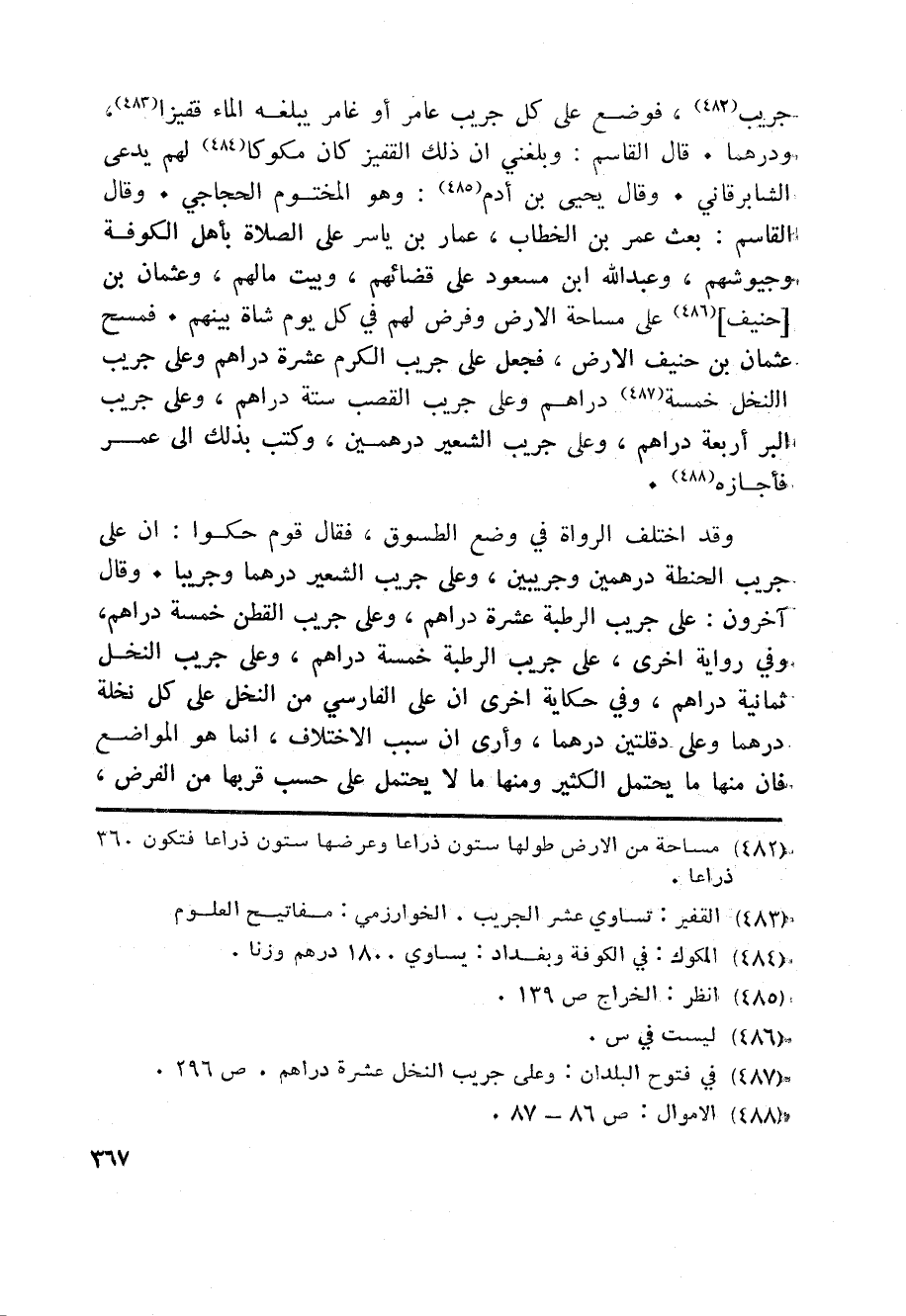 جريب «482» ، فوضع على كل جريب عامر أو غامر يبلغه الماء قفيزا «483» ، ودرهما. قال القاسم: وبلغني ان ذلك القفيز كان مكوكا «484» لهم يدعى الشابرقاني. وقال يحيى بن أدم «485» : وهو المختوم الحجاجي. وقال القاسم: بعث عمر بن الخطاب، عمار بن ياسر على الصلاة بأهل الكوفة وجيوشهم، وعبد الله ابن مسعود على قضائهم، وبيت مالهم، وعثمان بن [حنيف] «486» على مساحة الارض وفرض لهم في كل يوم شاة بينهم. فمسح عثمان بن حنيف الارض، فجعل على جريب الكرم عشرة دراهم وعلى جريب النخل خمسة «487» دراهم وعلى جريب القصب ستة دراهم، وعلى جريب البر أربعة دراهم، وعلى جريب الشعير درهمين، وكتب بذلك الى عمر فأجازه «488» .