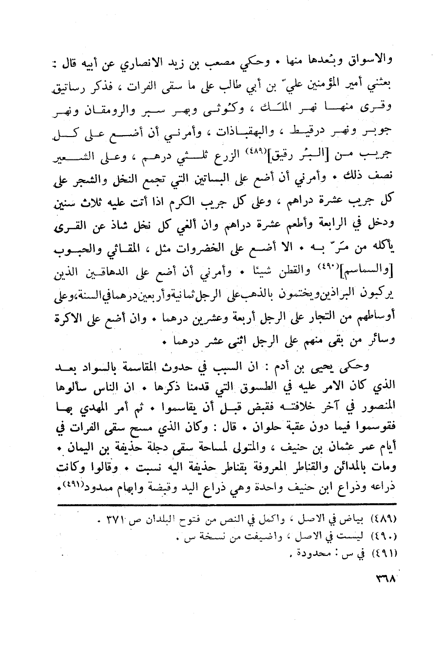بعثني أمير المؤمنين عليّ بن أبي طالب على ما سقى الفرات، فذكر رساتيق وقرى منها نهر الملك، وكوثى وبهر سبر والرومقان ونهر جوبر ونهر درقيط، والبهقباذات، وأمرني أن أضع على كل جريب من [البر رقيق] «489» الزرع ثلثي درهم، وعلى الشعير نصف ذلك. وأمرني أن أضع على البساتين التي تجمع النخل والشجر على كل جريب عشرة دراهم، وعلى كل جريب الكرم اذا أتت عليه ثلاث سنين ودخل في الرابعة وأطعم عشرة دراهم وان ألغي كل نخل شاذ عن القرى يأكله من مرّ به. الا أضع على الخضروات مثل، المقاثي والحبوب [والسماسم] «490» والقطن شيئا. وأمرني أن أضع على الدهاقين الذين يركبون البراذين ويختمون بالذهب على الرجل ثمانية وأربعين درهما في السنة، وعلى اوساطهم من التجار على الرجل اربعة وعشرين درهما. وان اضع على الاكرة وسائر من بقى منهم على الرجل اثنى عشر درهما.