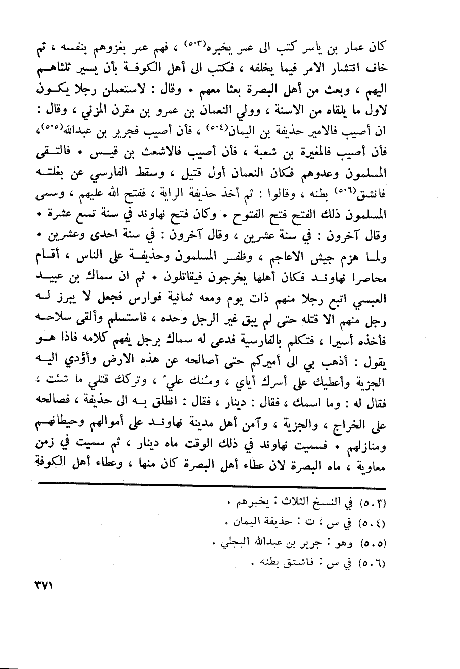 ان أصيب فالامير حذيفة بن اليمان «504» ، فأن أصيب فجرير بن عبد الله «505» ، فأن أصيب فالمغيرة بن شعبة، فأن أصيب فالاشعث بن قيس. فالتقى المسلمون وعدوهم فكان النعمان أول قتيل، وسقط الفارسي عن بغلته فانشق 50»