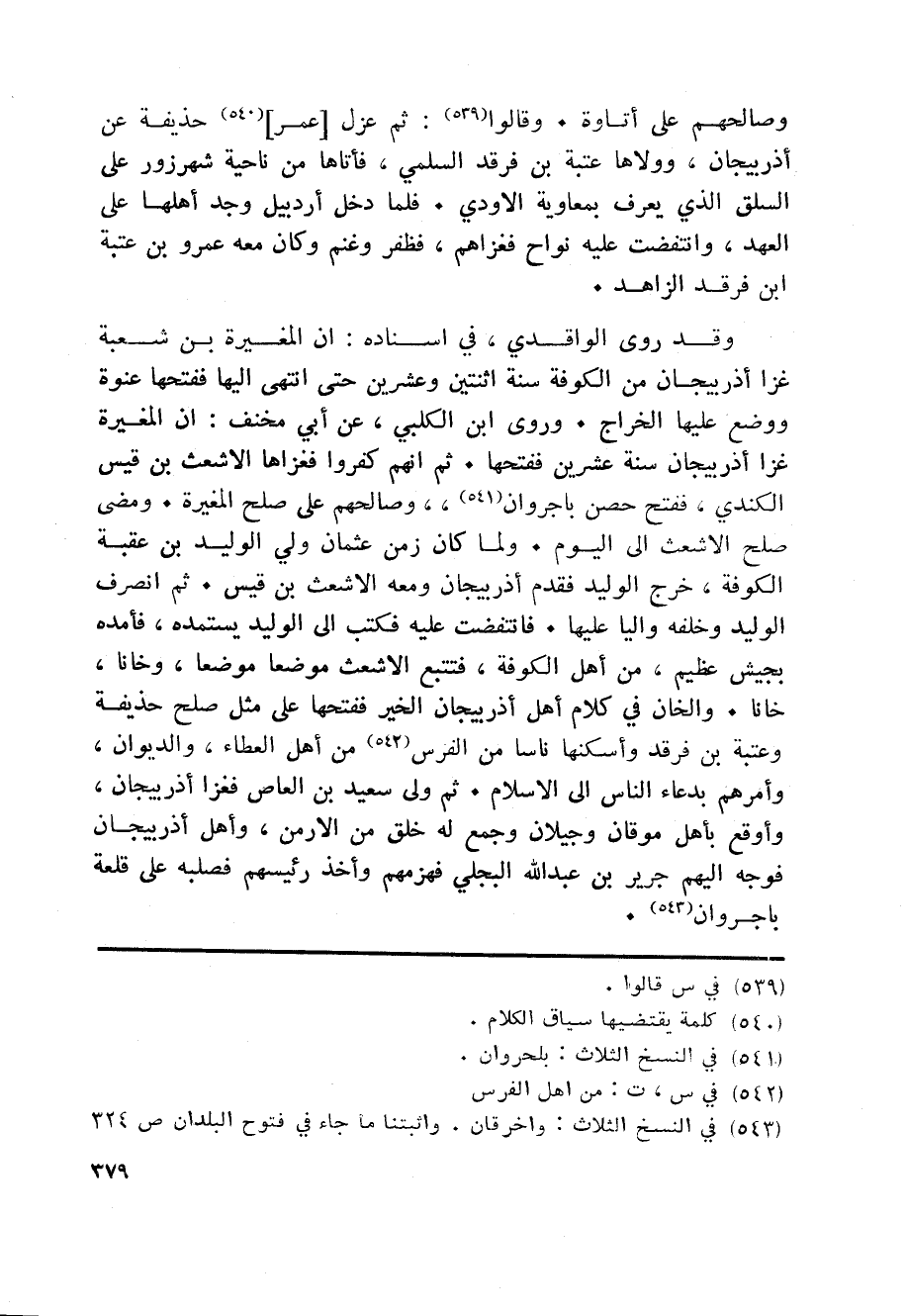 وقد روى الواقدي، في اسناده: ان المغيرة بن شعبة غزا أذربيجان من الكوفة سنة اثنتين وعشرين حتى انتهى اليها ففتحها عنوة ووضع عليها الخراج. وروى ابن الكلبي، عن أبي مخنف: ان المغيرة غزا أذربيجان سنة عشرين ففتحها. ثم انهم كفروا فغزاها الاشعث بن قيس الكندي، ففتح حصن باجروان «541» ، وصالحهم على صلح المغيرة. ومضى صلح الاشعث الى اليوم. ولما كان زمن عثمان ولي الوليد بن عقبة الكوفة، خرج الوليد فقدم أذربيجان ومعه الاشعث بن قيس. ثم انصرف الوليد وخلفه واليا عليها. فانتفضت عليه فكتب الى الوليد يستمده، فأمده بجيش عظيم، من أهل الكوفة، فتتبع الاشعث موضعا موضعا، وخانا، خانا. والخان في كلام أهل أذربيجان الخير ففتحها على مثل صلح حذيفة وعتبة بن فرقد وأسكنها ناسا من الفرس «542» من أهل العطاء، والديوان، وأمرهم بدعاء الناس الى الاسلام. ثم ولى سعيد بن العاص فغزا أذربيجان، وأوقع بأهل موقان وجيلان وجمع له خلق من الارمن، وأهل أذربيجان فوجه اليهم جرير بن عبد الله البجلي فهزمهم وأخذ رئيسهم فصلبه على قلعة باجروان «543» .