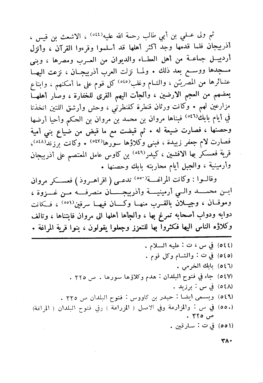 ثم ولى علي بن أبي طالب رحمة الله عليه «544» ، الاشعث بن قيس، أذربيجان فلما قدمها وجد أكثر أهلها قد أسلموا وقرءوا القرآن، وأنزل أردبيل جماعة من أهل العطاء والديوان من العرب ومصرها، وبنى مسجدها ووسع بعد ذلك. ولما نزلت العرب أذربيجان، نزعت اليها عشائرها من المصريّن، والشام وغلب «545» كل قوم على ما أمكنهم، وابتاع بعضهم من العجم الارضين، وألجأت اليهم القرى للخفارة، وصار أهلها مزارعين لهم. وكانت ورثان قنطرة كقنطرتي، وحش وأرشق اللتين اتخذتا في أيام بابك «546» فبناها مروان بن محمد بن مروان بن الحكم وأحيا أرضها وحصنها، فصارت ضيعة له. ثم قبضت مع ما قبض من ضياع بني أمية فصارت لام جعفر زبيدة، فبنى وكلاؤها سورها «547» . وكانت برزند «548» ، قرية فعسكر بها الافشين، كيدر «549» بن كاوس عامل المعتصم على أذربيجان وأرمينية، والجبل أيام محاربته بابك وحصنها.