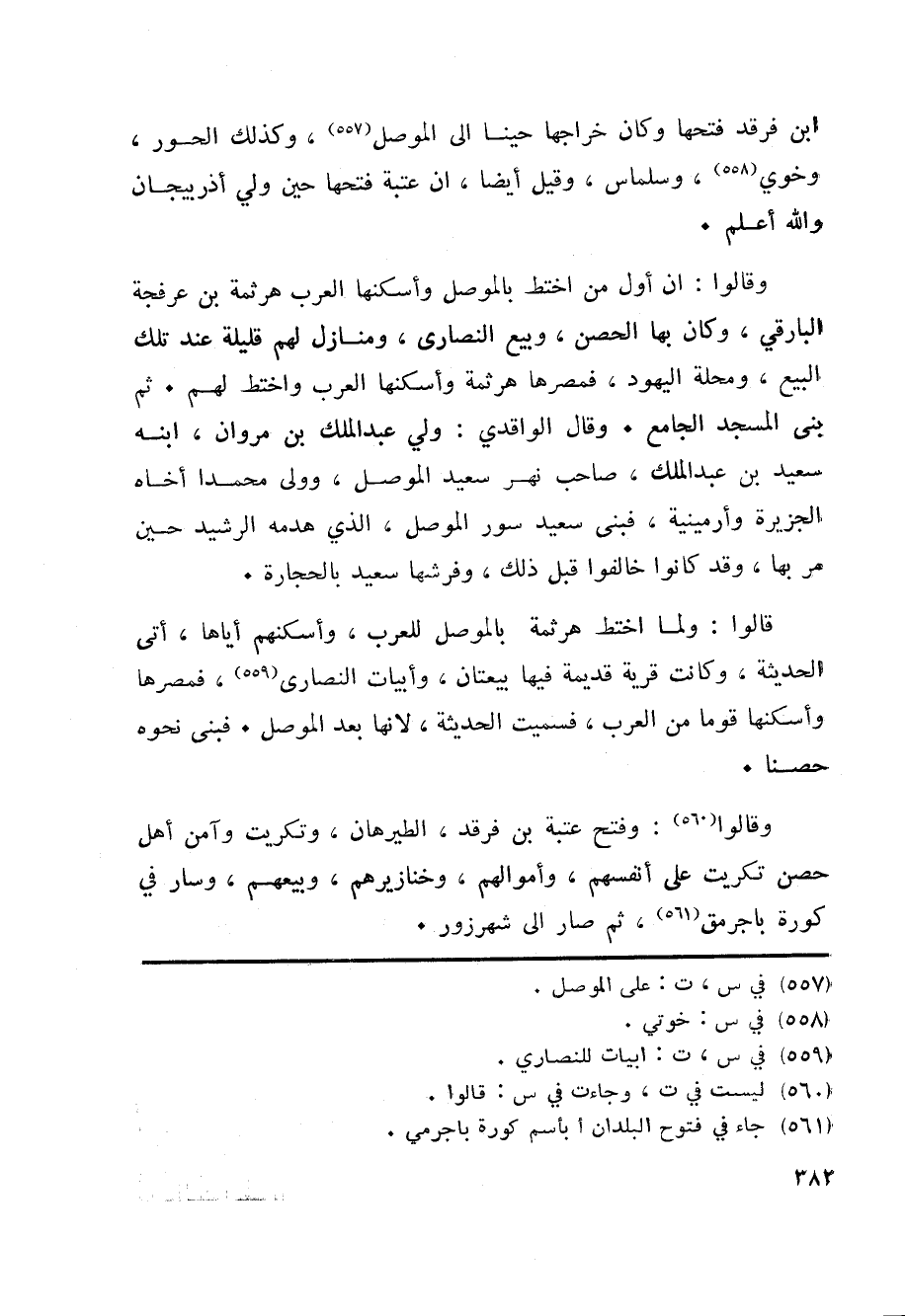 ابن فرقد فتحها وكان خراجها حينا الى الموصل «557» ، وكذلك الحور، وخوي «558» ، وسلماس، وقيل أيضا، ان عتبة فتحها حين ولي أذربيجان والله أعلم.