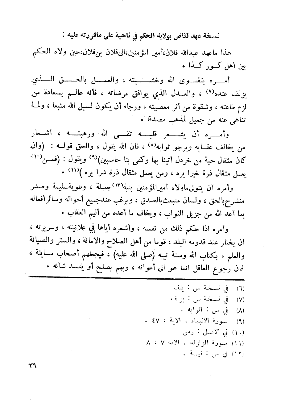 هذا ما عهد عبد الله فلان، أمير المؤمنين، الى فلان بن فلان، حين ولاه الحكم بين أهل كور كذا.