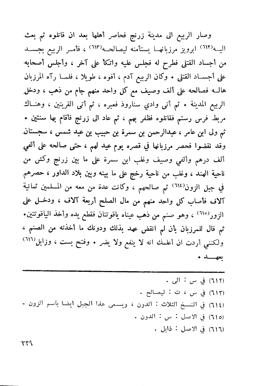 وصار الربيع الى مدينة زرنج فحاصر أهلها بعد ان قاتلوه ثم بعث اليه «612» ابرويز مرزبانها يستأمنه ليصالحه «613» ، فأمر الربيع بجسد من أجساد القتلى فطرح له فجلس عليه واتكأ على آخر، وأجلس أصحابه على أجساد القتلى. وكان الربيع آدم، أفوه، طويلا، فلما رآه المرزبان هاله فصالحه على ألف وصيف مع كل واحد منهم جام من ذهب، ودخل الربيع المدينة. ثم أتى وادي سناروذ فعبره، ثم أتى القريتين، وهناك مربط فرس رستم فقاتلوه فظفر بهم، ثم عاد الى زرنج فأقام بها سنتين.