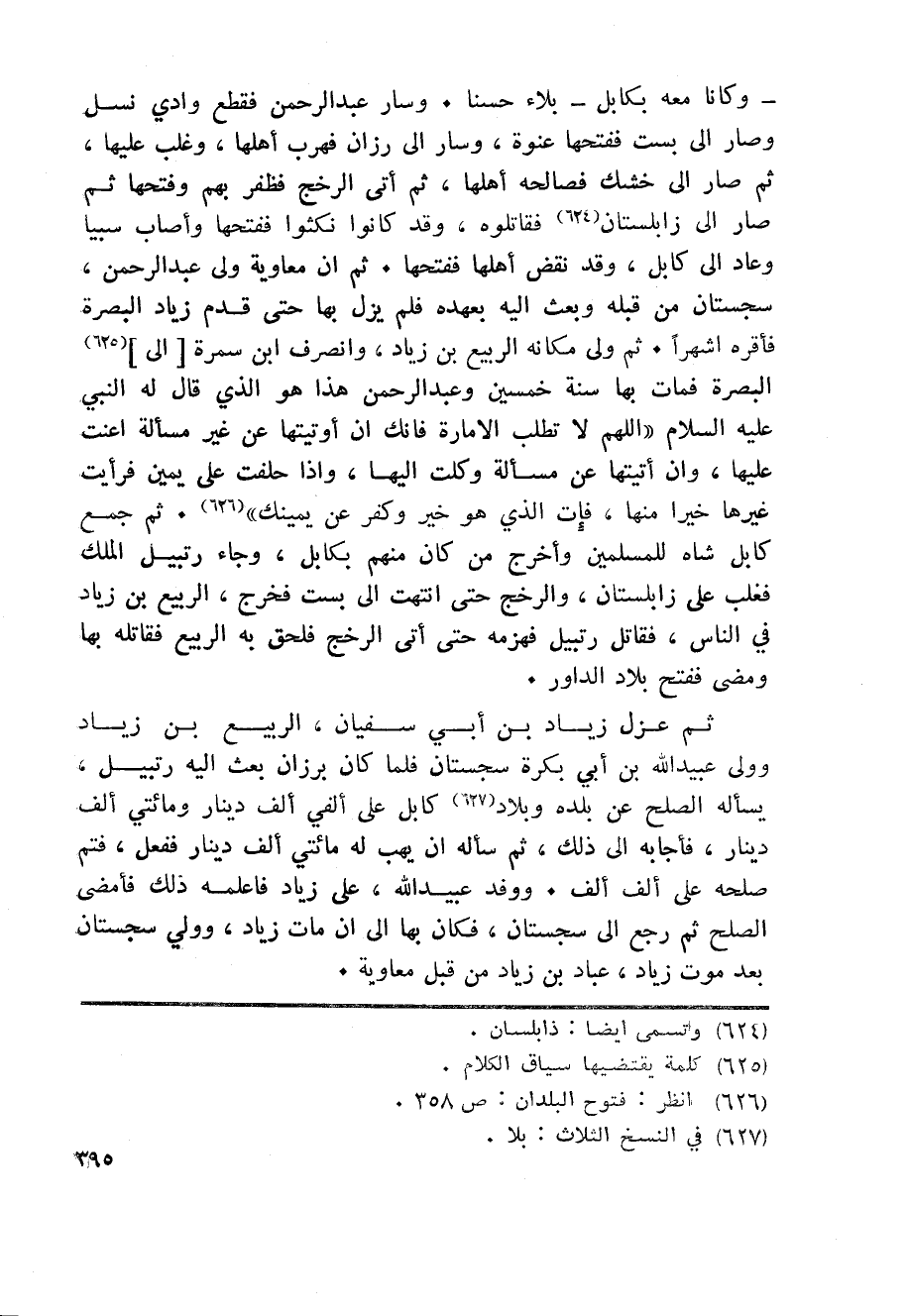 ثم عزل زياد بن أبي سفيان، الربيع بن زياد وولى عبيد الله بن أبي بكرة سجستان فلما كان برزان بعث اليه رتبيل، يسأله الصلح عن بلده وبلاد «627» كابل على ألفي ألف دينار ومائتي ألف دينار، فأجابه الى ذلك، ثم سأله ان يهب له مائتي ألف دينار ففعل، فتم صلحه على ألف ألف. ووفد عبيد الله، على زياد فاعلمه ذلك فأمضى الصلح ثم رجع الى سجستان، فكان بها الى ان مات زياد، وولي سجستان بعد موت زياد، عباد بن زياد من قبل معاوية.