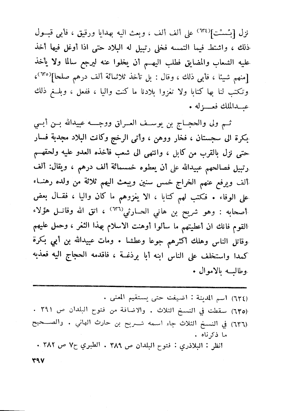 نزل [بست] «634» على ألف ألف، وبعث اليه بهدايا ورقيق، فأبى قبول ذلك، واشتط فيما التمسه فخلى رتبيل له البلاد حتى اذا أوغل فيها أخذ عليه الشعاب والمضايق فطلب اليهم أن يخلوا عنه ليرجع سالما ولا يأخذ [منهم شيئا، فأبى ذلك، وقال: بل تأخذ ثلاثمائة ألف درهم صلحا] «635» ، وتكتب لنا بها كتابا ولا تغزوا بلادنا ما كنت واليا، ففعل، وبلغ ذلك عبد الملك فعزله.