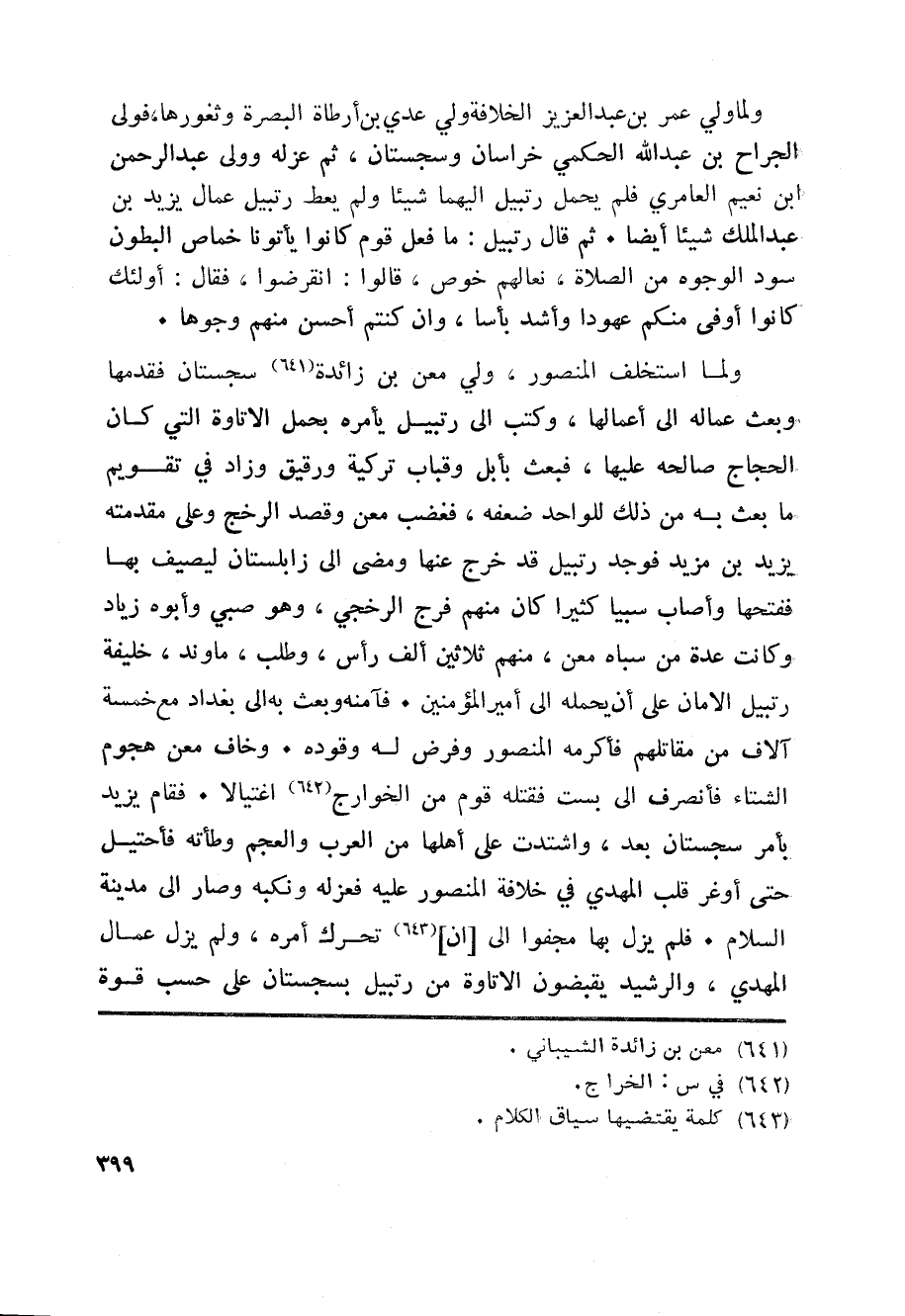 ولما استخلف المنصور، ولي معن بن زائدة «641» سجستان فقدمها وبعث عماله الى أعمالها، وكتب الى رتبيل يأمره بحمل الاتاوة التي كان الحجاج صالحه عليها، فبعث بأبل وقباب تركية ورقيق وزاد في تقويم ما بعث به من ذلك للواحد ضعفه، فغضب معن وقصد الرخج وعلى مقدمته يزيد بن مزيد فوجد رتبيل قد خرج عنها ومضى الى زابلستان ليصيف بها ففتحها وأصاب سبيا كثيرا كان منهم فرج الرخجي، وهو صبي وأبوه زياد وكانت عدة من سباه معن، منهم ثلاثين ألف رأس، وطلب، ماوند، خليفة رتبيل الامان على أن يحمله الى أمير المؤمنين. فآمنه وبعث به الى بغداد مع خمسة آلاف من مقاتلهم فأكرمه المنصور وفرض له وقوده. وخاف معن هجوم الشتاء فأنصرف الى بست فقتله قوم من الخوارج «642» اغتيالا. فقام يزيد بأمر سجستان بعد، واشتدت على أهلها من العرب والعجم وطأته فأحتيل حتى أوغر قلب المهدي في خلافة المنصور عليه فعزله ونكبه وصار الى مدينة السلام. فلم يزل بها مجفوا الى [ان] «643» تحرك أمره، ولم يزل عمال المهدي، والرشيد يقبضون الاتاوة من رتبيل بسجستان على حسب قوة