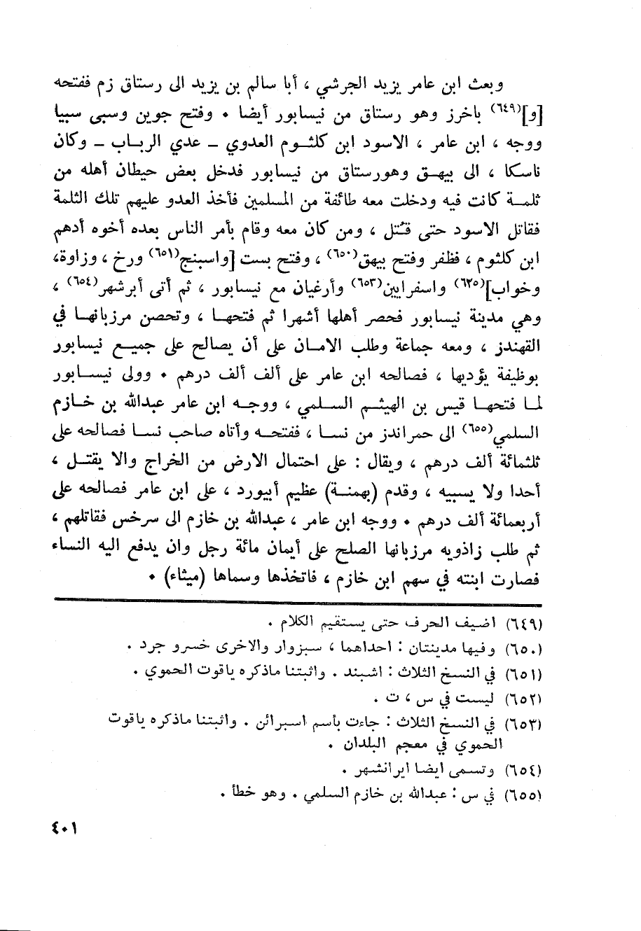 وبعث ابن عامر يزيد الجرشي، أبا سالم بن يزيد الى رستاق زم ففتحه [و] «649» باخرز وهو رستاق من نيسابور أيضا. وفتح جوين وسبى سبيا ووجه، ابن عامر، الاسود ابن كلثوم العدوي- عدي الرباب- وكان ناسكا، الى بيهق وهورستاق من نيسابور فدخل بعض حيطان أهله من ثلمة كانت فيه ودخلت معه طائفة من المسلمين فأخذ العدو عليهم تلك الثلمة فقاتل الاسود حتى قتل، ومن كان معه وقام بأمر الناس بعده أخوه أدهم ابن كلثوم، فظفر وفتح بيهق «650» ، وفتح بست [واسبنج «651» ورخ، وزاوة، وخواب] «652» واسفرايين «653» وأرغيان مع نيسابور، ثم أتى أبرشهر «654» ، وهي مدينة نيسابور فحصر أهلها أشهرا ثم فتحها، وتحصن مرزبانها في القهندز، ومعه جماعة وطلب الامان على أن يصالح على جميع نيسابور بوظيفة يؤديها، فصالحه ابن عامر على ألف ألف درهم. وولى نيسابور لما فتحها قيس بن الهيثم السلمي، ووجه ابن عامر عبد الله بن خازم السلمي «655» الى حمراندز من نسا، ففتحه وأتاه صاحب نسا فصالحه على ثلثمائة ألف درهم، ويقال: على احتمال الارض من الخراج والا يقتل، أحدا ولا يسبيه، وقدم (بهمنة) عظيم أبيورد، على ابن عامر فصالحه على أربعمائة ألف درهم. ووجه ابن عامر، عبد الله بن خازم الى سرخس فقاتلهم، ثم طلب زاذويه مرزبانها الصلح على أيمان مائة رجل وان يدفع اليه النساء فصارت ابنته في سهم ابن خازم، فاتخذها وسماها (ميثاء) .