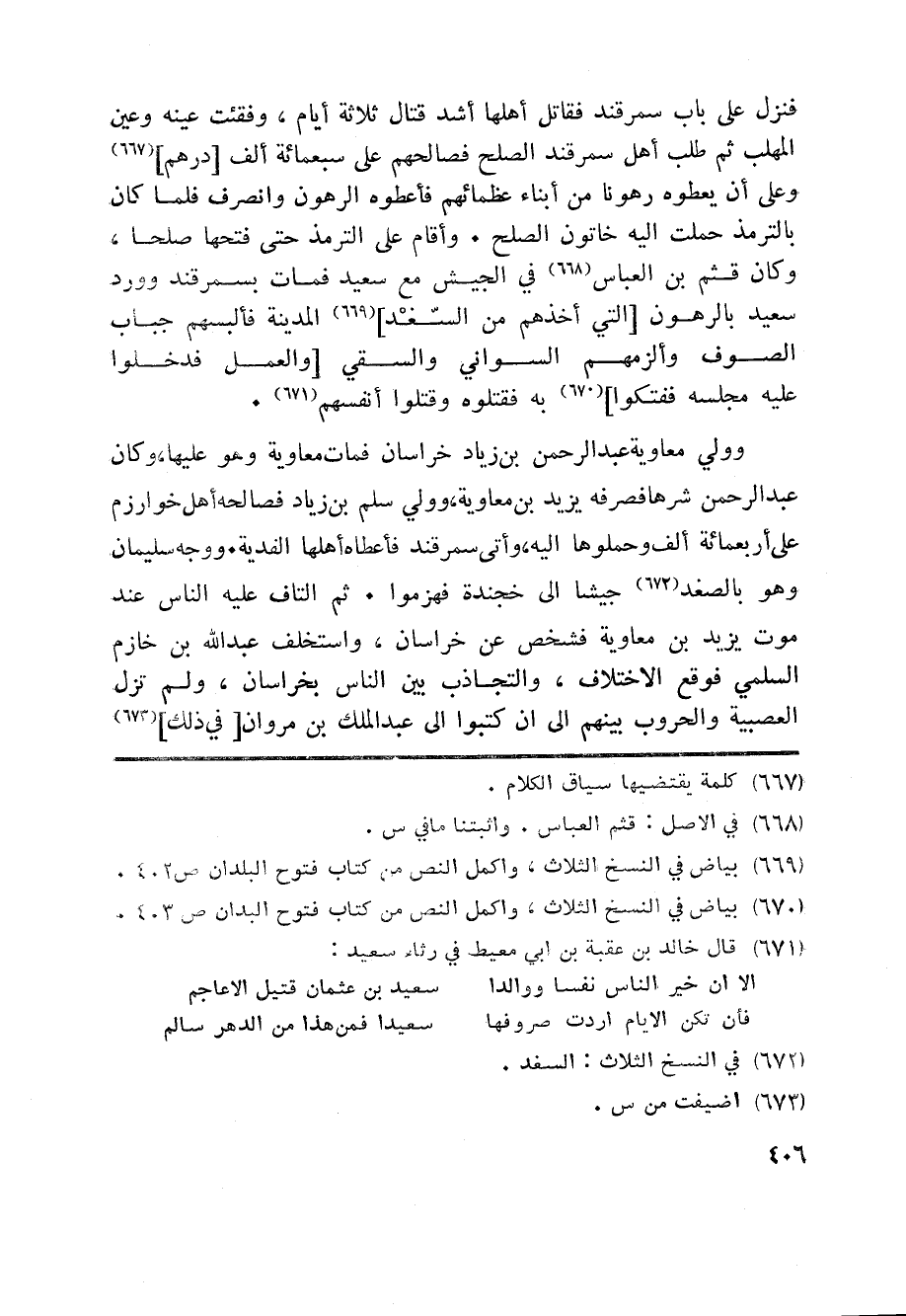 وولي معاوية عبد الرحمن بن زياد خراسان فمات معاوية وهو عليها، وكان عبد الرحمن شرها فصرفه يزيد بن معاوية، وولي سلم بن زياد فصالحه أهل خوارزم على أربعمائة ألف وحملوها اليه، وأتى سمرقند فأعطاه أهلها الفدية. ووجه سليمان وهو بالصغد «672» جيشا الى خجندة فهزموا. ثم التاف عليه الناس عند موت يزيد بن معاوية فشخص عن خراسان، واستخلف عبد الله بن خازم السلمي فوقع الاختلاف، والتجاذب بين الناس بخراسان، ولم تزل العصبية والحروب بينهم الى ان كتبوا الى عبد الملك بن مروان [في ذلك] «673»