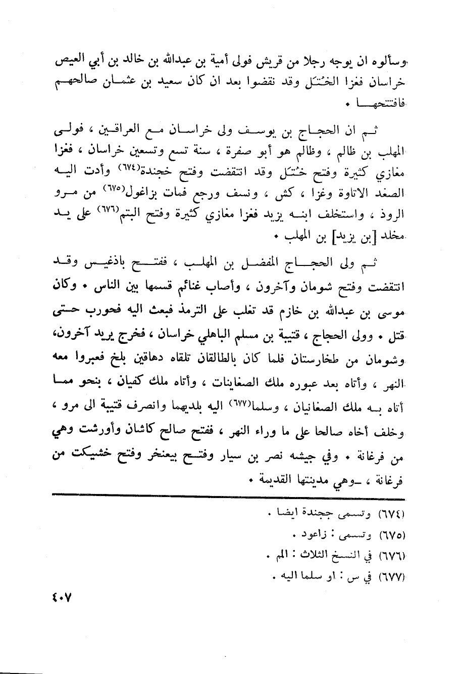 ثم ان الحجاج بن يوسف ولى خراسان مع العراقين، فولى المهلب بن ظالم، وظالم هو أبو صفرة، سنة تسع وتسعين خراسان، فغزا مغازي كثيرة وفتح ختل وقد انتقضت وفتح خجندة «674» وأدت اليه الصغد الاتاوة وغزا، كش، ونسف ورجع فمات بزاغول «675» من مرو الروذ، واستخلف ابنه يزيد فغزا مغازي كثيرة وفتح البتم «676» على يد مخلد [بن يزيد] بن المهلب.