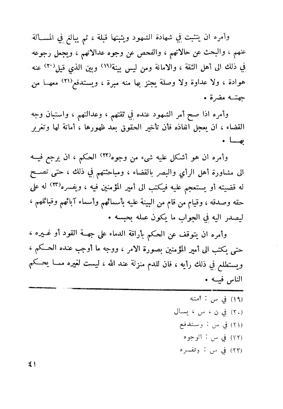 وأمره ان هو أشكل عليه شيء من وجوه «22» الحكم، ان يرجع فيه الى مشاورة أهل الرأي والبصر بالقضاء، ومباحثتهم في ذلك، حتى تصح له قضيته أو يستعجم عليه فيكتب الى أمير المؤمنين فيه، ويفسره «23» له على حقه وصدقه، وقيام من قام من البينة عليه بأسمائهم وأسماء آبائهم وقبائلهم، ليصدر اليه في الجواب ما يكون عمله بحبسه.