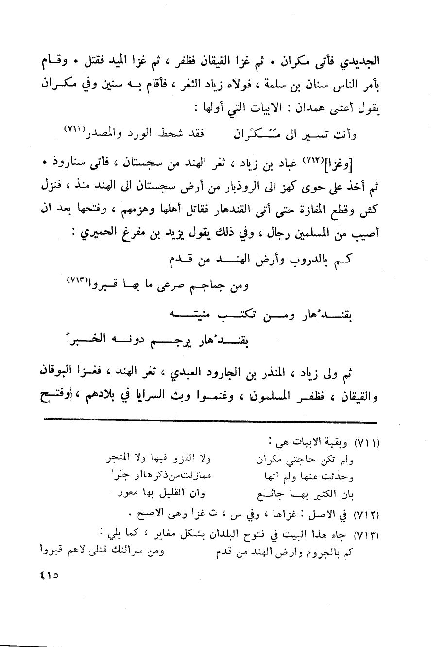 الجديدي فأتى مكران. ثم غزا القيقان فظفر، ثم غزا الميد فقتل. وقام بأمر الناس سنان بن سلمة، فولاه زياد الثغر، فأقام به سنين وفي مكران يقول أعشى همدان: الابيات التي أولها: