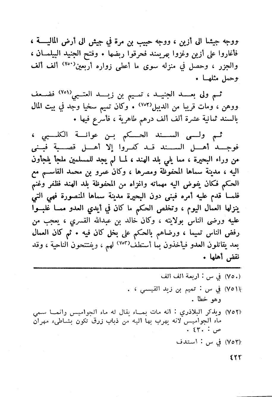 ثم ولى بعد الجنيد، تميم بن زيد العتبي «751» فضعف ووهن، ومات قريبا من الديبل «752» . وكان تميم سخيا وجد في بيت المال بالسند ثمانية عشرة ألف ألف درهم طاهرية، فأسرع فيها.