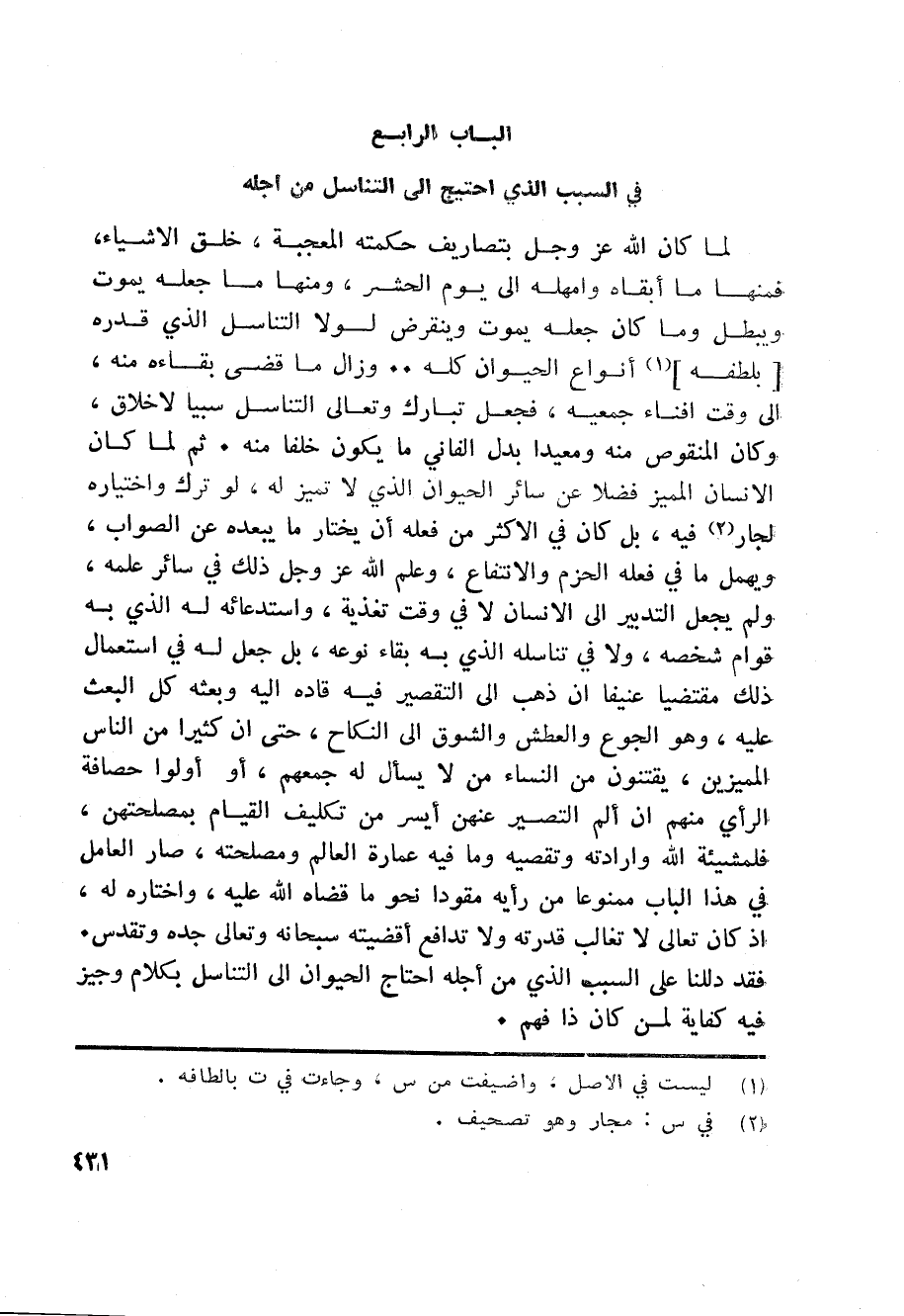 الباب الرابع في السبب الذي احتيج الى التناسل من أجله