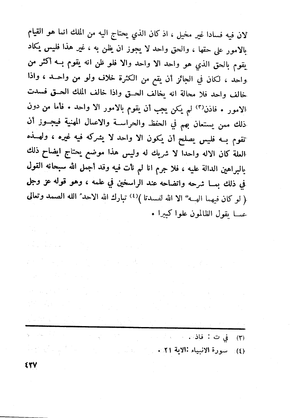 لان فيه فسادا غير مخيل، اذ كان الذي يحتاج اليه من الملك انما هو القيام بالامور على حقها، والحق واحد لا يجوز ان يظن به، غير هذا فليس يكاد يقوم بالحق الذي هو واحد الا واحد والا فلو ظن انه يقوم به أكثر من واحد، لكان في الجائز أن يقع من الكثرة خلاف ولو من واحد، واذا خالف واحد فلا محالة انه يخالف الحق واذا خالف الملك الحق فسدت الامور. فاذن «3» لم يكن يجب أن يقوم بالامور الا واحد. فأما من دون ذلك ممن يستعان بهم في الحفظ والحراسة والاعمال المهنية فيجوز أن تقوم به فليس يصلح أن يكون الا واحد لا يشركه فيه غيره، ولهذه العلة كان الاله واحدا لا شريك له وليس هذا موضع يحتاج ايضاح ذلك بالبراهين الدالة عليه، فلا جرم انا لم نأت فيه وقد أجمل الله سبحانه القول في ذلك بما شرحه واتضاحه عند الراسخين في علمه، وهو قوله عز وجل (لو كان فيهما آلهة الا الله لفسدتا) «4» تبارك الله الاحد الله الصمد وتعالى عما يقول الظالمون علوا كبيرا.