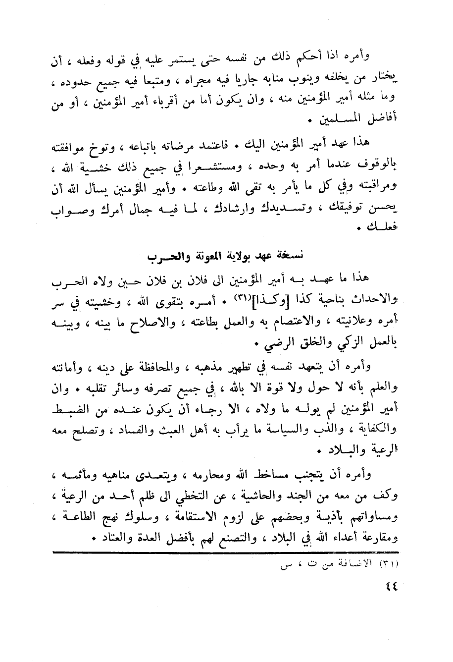 هذا ما عهد به أمير المؤمنين الى فلان بن فلان حين ولاه الحرب والاحداث بناحية كذا [وكذا] «31» . أمره بتقوى الله، وخشيته في سر أمره وعلانيته، والاعتصام به والعمل بطاعته، والاصلاح ما بينه، وبينه بالعمل الزكي والخلق الرضي.