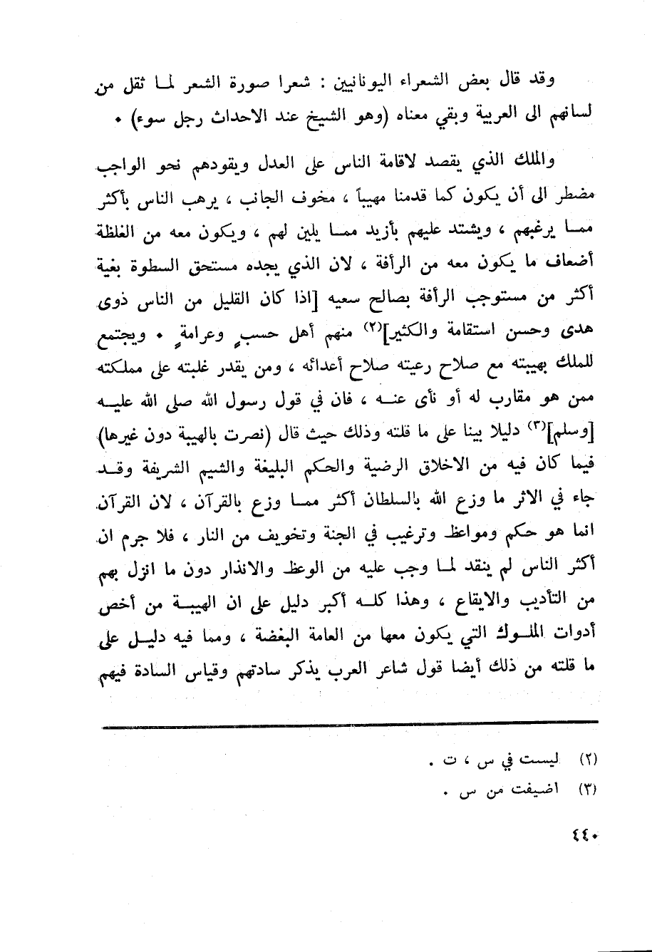 والملك الذي يقصد لاقامة الناس على العدل ويقودهم نحو الواجب مضطر الى أن يكون كما قدمنا مهيبا، مخوف الجانب، يرهب الناس بأكثر مما يرغبهم، ويشتد عليهم بأزيد مما يلين لهم، ويكون معه من الغلظة أضعاف ما يكون معه من الرأفة، لان الذي يجده مستحق السطوة بغية أكثر من مستوجب الرأفة بصالح سعيه [اذا كان القليل من الناس ذوى هدى وحسن استقامة والكثير] «2» منهم أهل حسب وعرامة. ويجتمع للملك بهيبته مع صلاح رعيته صلاح أعدائه، ومن يقدر غلبته على مملكته ممن هو مقارب له أو نأى عنه، فان في قول رسول الله صلى الله عليه [وسلم] «3» دليلا بينا على ما قلته وذلك حيث قال (نصرت بالهيبة دون غيرها) فيما كان فيه من الاخلاق الرضية والحكم البليغة والشيم الشريفة وقد جاء في الاثر ما وزع الله بالسلطان أكثر مما وزع بالقرآن، لان القرآن انما هو حكم ومواعظ وترغيب في الجنة وتخويف من النار، فلا جرم ان أكثر الناس لم ينقد لما وجب عليه من الوعظ والانذار دون ما انزل بهم من التأديب والايقاع، وهذا كله أكبر دليل على ان الهيبة من أخص أدوات الملوك التي يكون معها من العامة البغضة، ومما فيه دليل على ما قلته من ذلك أيضا قول شاعر العرب يذكر سادتهم وقياس السادة فيهم