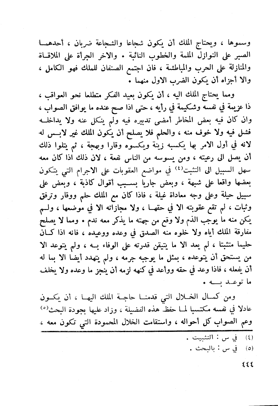 ومن كمال الخلال التي قدمنا حاجة الملك اليها، أن يكون عادلا في نفسه مكتسبا لما حفظ هذه الفضيلة، وزاد عليها بجودة البحث «5» وعم الصواب كل أحواله، واستقامت الخلال المحمودة التي تكون معه،