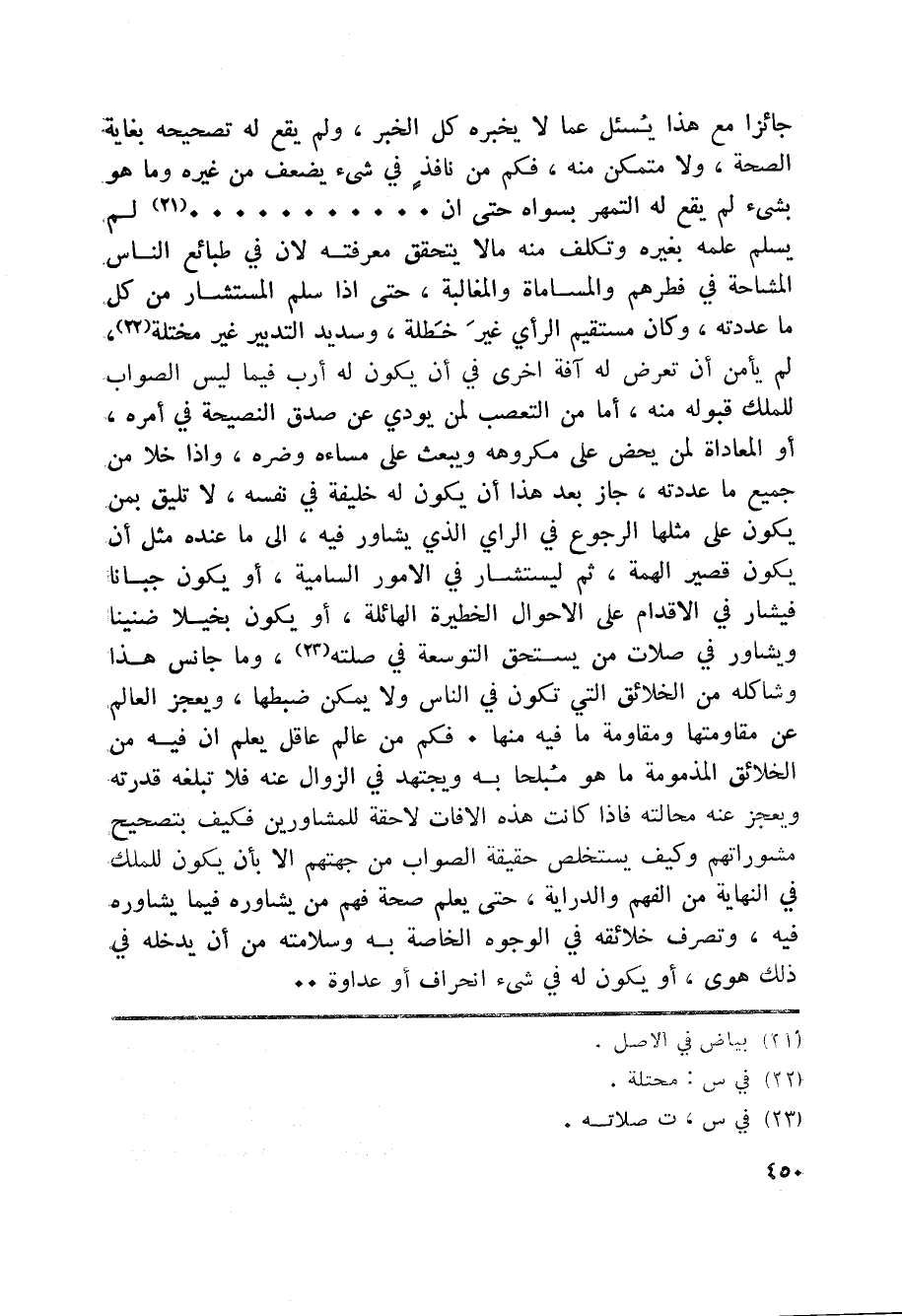 جائزا مع هذا يسئل عما لا يخبره كل الخبر، ولم يقع له تصحيحه بغاية الصحة، ولا متمكن منه، فكم من نافذ في شيء يضعف من غيره وما هو بشيء لم يقع له التمهر بسواه حتى ان......... «21» لم يسلم علمه بغيره وتكلف منه مالا يتحقق معرفته لان في طبائع الناس المشاحة في فطرهم والمساماة والمغالبة، حتى اذا سلم المستشار من كل ما عددته، وكان مستقيم الرأي غير خطلة، وسديد التدبير غير مختلة «22» ، لم يأمن أن تعرض له آفة اخرى في أن يكون له أرب فيما ليس الصواب للملك قبوله منه، أما من التعصب لمن يودي عن صدق النصيحة في أمره، أو المعاداة لمن يحض على مكروهه ويبعث على مساءه وضره، واذا خلا من جميع ما عددته، جاز بعد هذا أن يكون له خليفة في نفسه، لا تليق بمن يكون على مثلها الرجوع في الراي الذي يشاور فيه، الى ما عنده مثل أن يكون قصير الهمة، ثم ليستشار في الامور السامية، أو يكون جبانا فيشار في الاقدام على الاحوال الخطيرة الهائلة، أو يكون بخيلا ضنينا ويشاور في صلات من يستحق التوسعة في صلته «23» ، وما جانس هذا وشاكله من الخلائق التي تكون في الناس ولا يمكن ضبطها، ويعجز العالم عن مقاومتها ومقاومة ما فيه منها. فكم من عالم عاقل يعلم ان فيه من الخلائق المذمومة ما هو مبلحا به ويجتهد في الزوال عنه فلا تبلغه قدرته ويعجز عنه محالته فاذا كانت هذه الافات لاحقة للمشاورين فكيف بتصحيح مشوراتهم وكيف يستخلص حقيقة الصواب من جهتهم الا بأن يكون للملك في النهاية من الفهم والدراية، حتى يعلم صحة فهم من يشاوره فيما يشاوره فيه، وتصرف خلائقه في الوجوه الخاصة به وسلامته من أن يدخله في ذلك هوى، أو يكون له في شيء انحراف أو عداوة ...